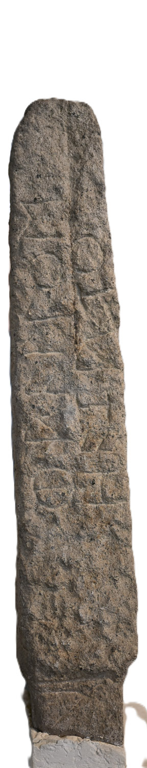 Fragment of an anchor stock, trapezoidal in shape with a rounded upper end, preserving approximately half of the original object. On its main face it bears a dedicatory inscription in Greek, incised in