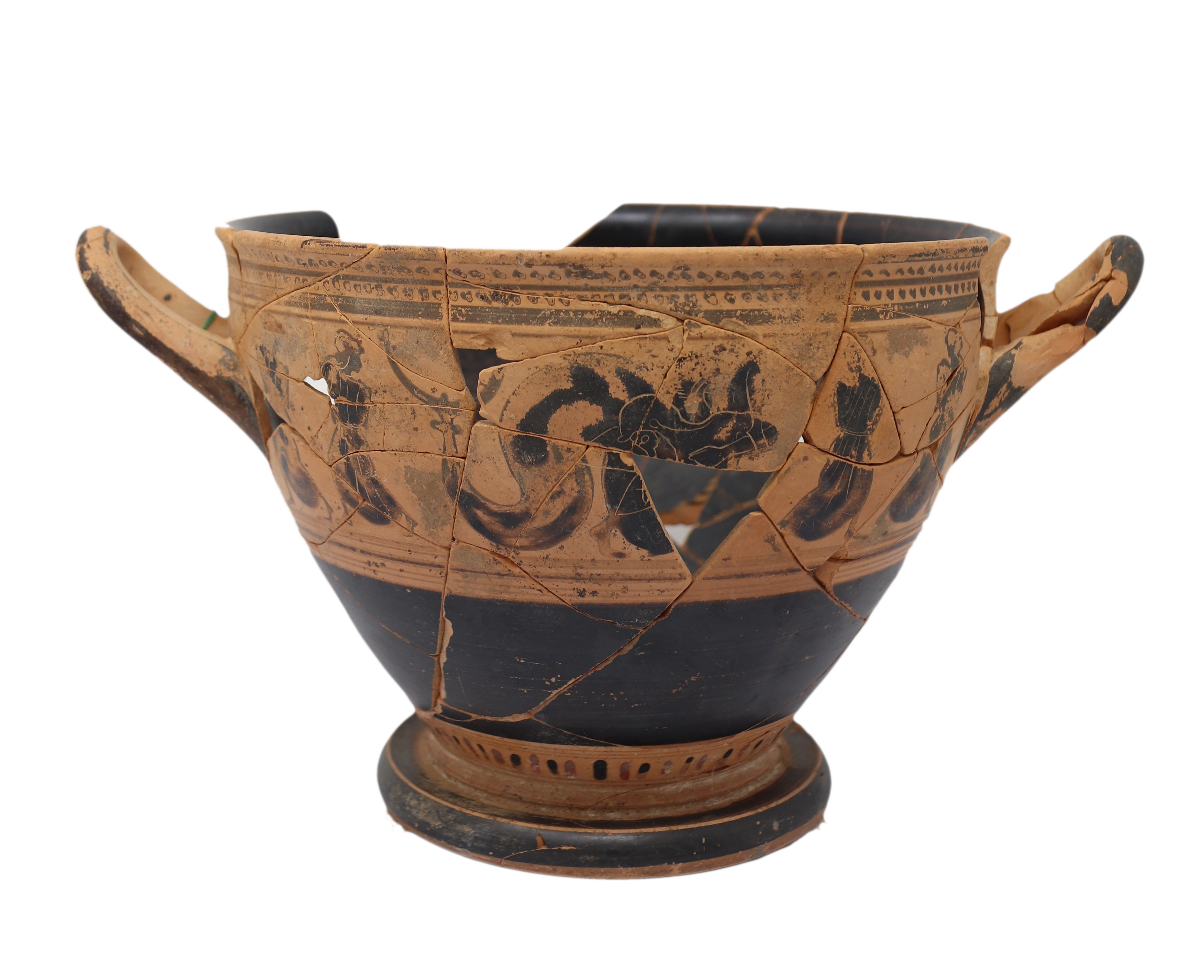 The Attic skyphos illustrates Heracles confronting Nereus, the old sea god, in an episode connected with the quest for the Hesperides. According to the myth, Heracles needed to question Nereus, a marine divinity endowed with the powers of metamorphosis and prophecy, in order to learn the route to the Garden of the Hesperides. Only after a long and stubborn struggle did Heracles succeed in subduing the god and obtaining the desired information. This scene is of great significance, as it directly links the myth of Heracles and Achilles to the sanctuary of Hera Lacinia, evoking the ancient mythological traditions associated with this sacred place of Magna Graecia.