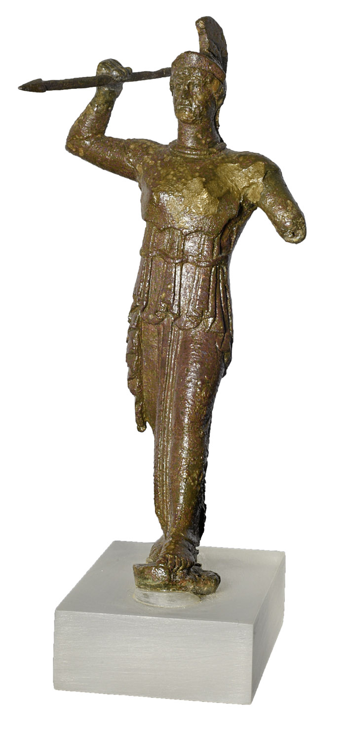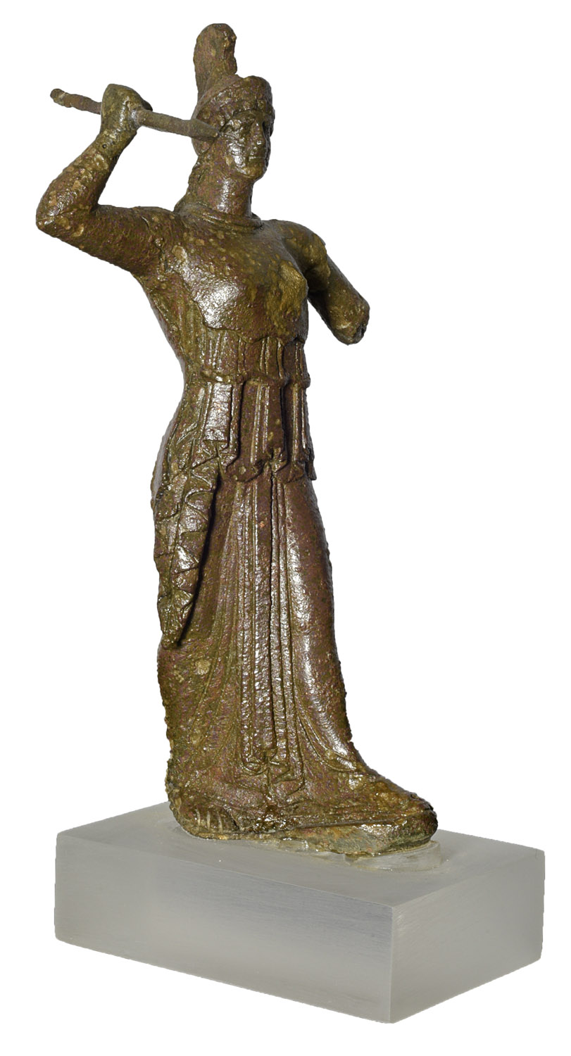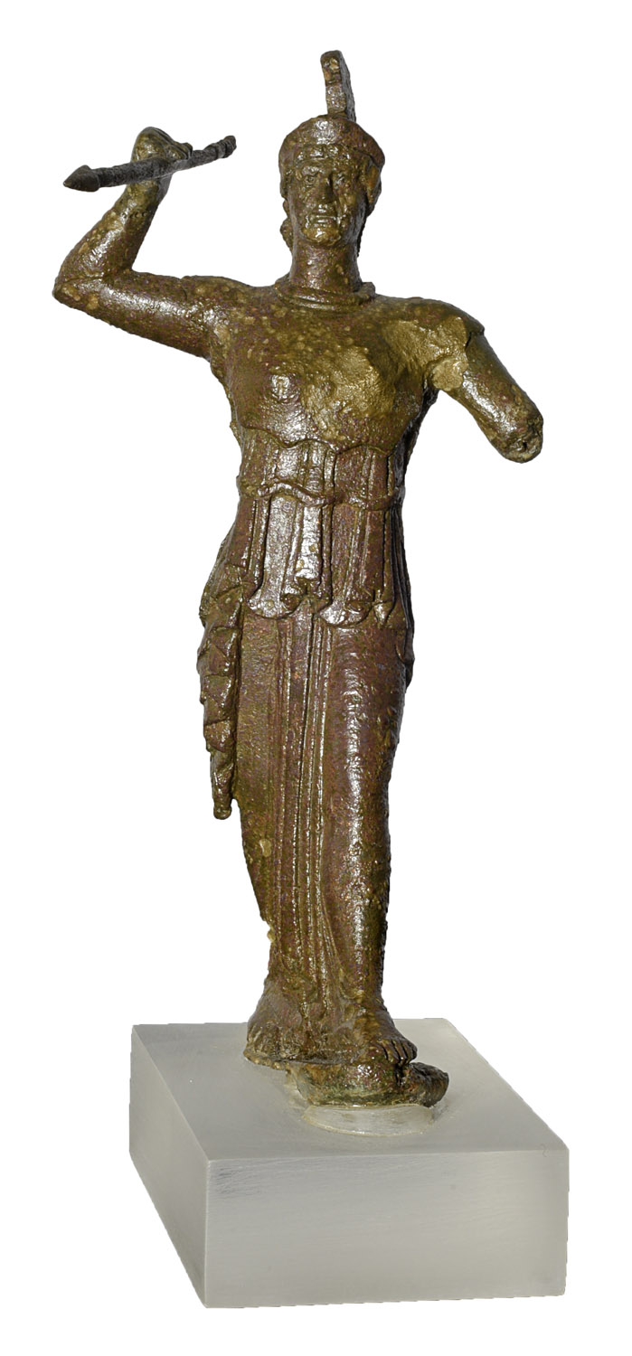 ... read more >The statuette, made of solid-cast bronze, depicts a female figure identifiable as Athena Promachos on the basis of her attributes and the dynamic, combative pose. The goddess is shown standing in a proud and stable stance, her gaze directed forward. She wears a helmet, a cuirass covering the upper part of her torso, and a long pleated garment (chiton) reaching down to her feet. In her right hand, drawn back, she would have held a spear, while in her left she carried a shield; both attributes are now missing.