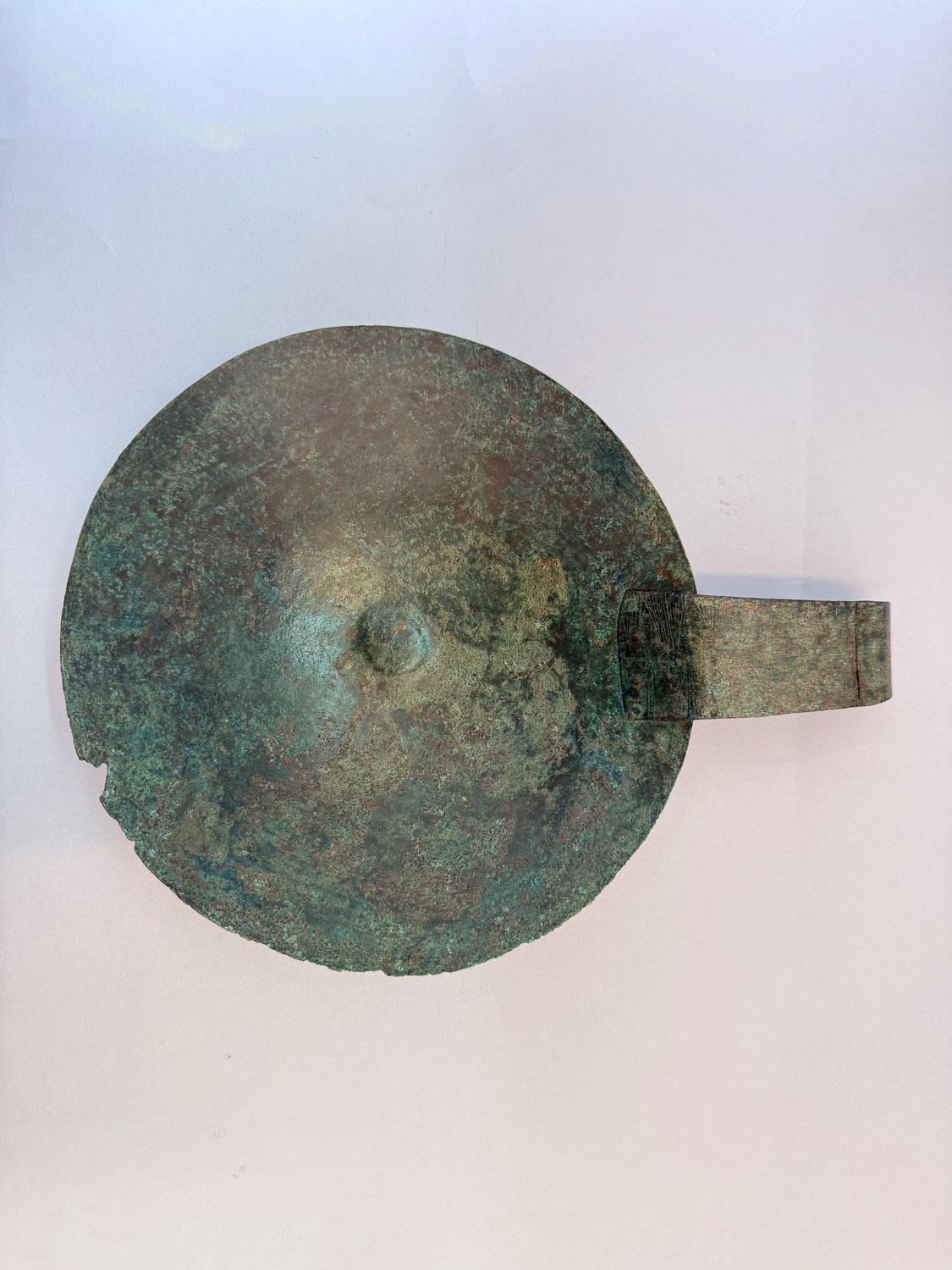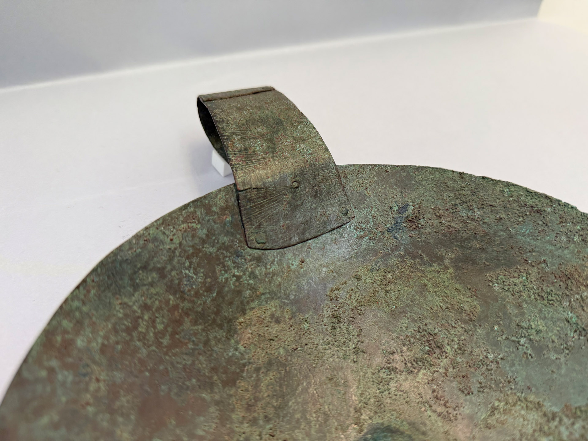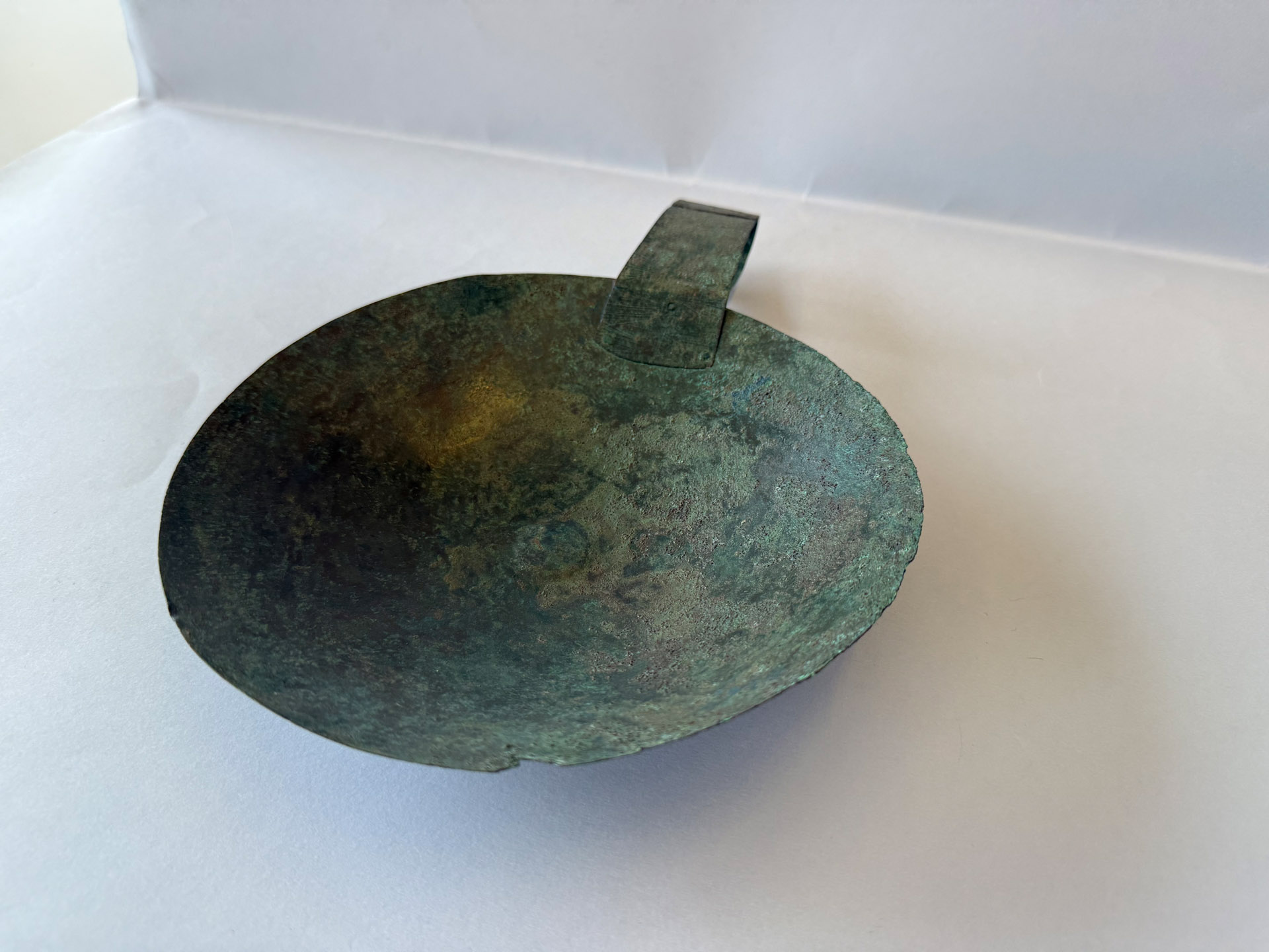 ... read more >The bronze vessel (patera or phiale) is characterized by a broad, shallow bowl with a thin rim. The handle, made from a folded strip of bronze sheet, consists of two elements attached to the bowl with three bronze rivets. Its surface is decorated with three rows of incised hatched triangles.