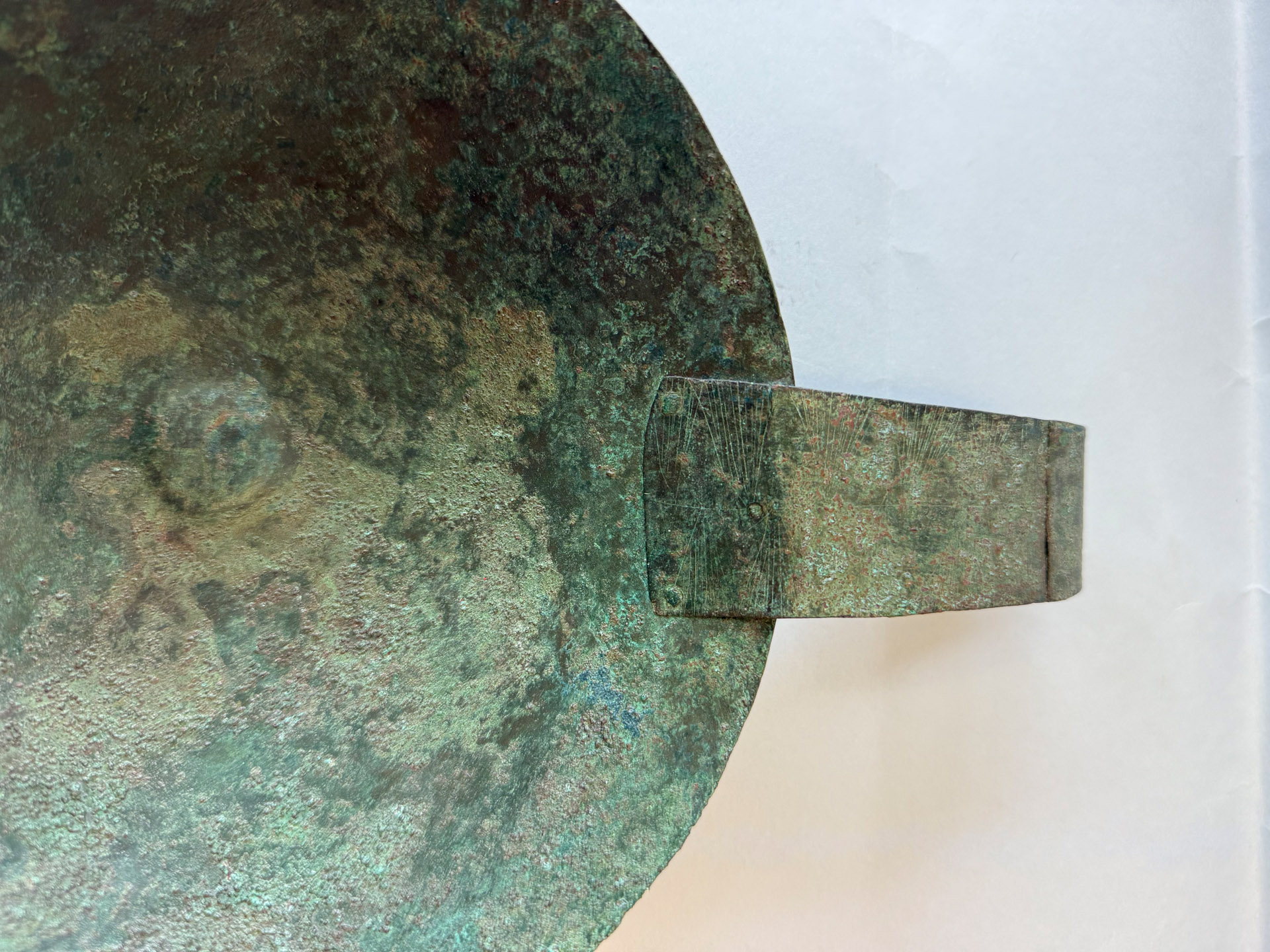 The bronze vessel (patera or phiale) is characterized by a broad, shallow bowl with a thin rim. The handle, made from a folded strip of bronze sheet, consists of two elements attached to the bowl with