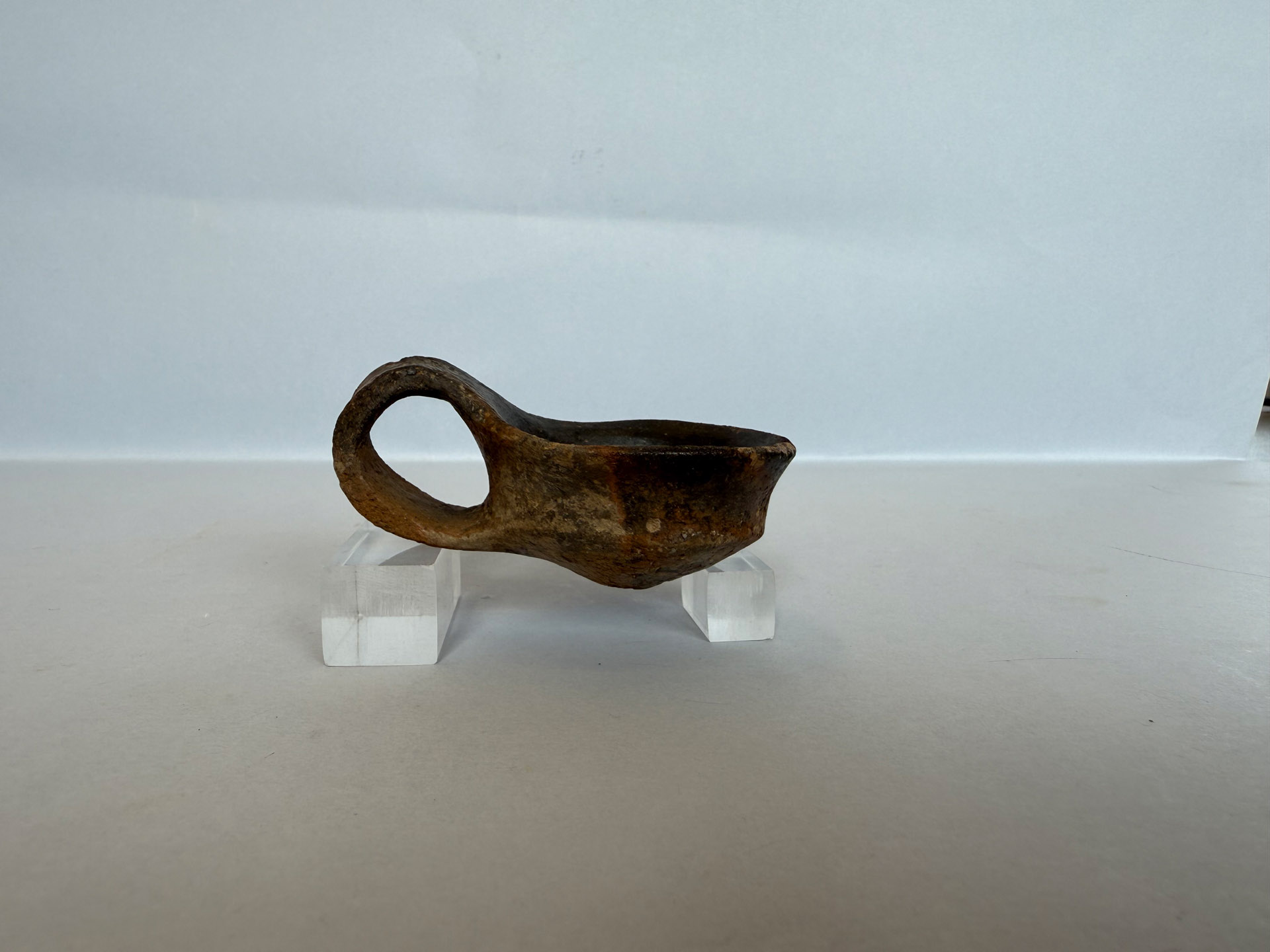 The cup comes from the locality of Fosso Potresimo, in the territory of Amendolara, where a protohistoric settlement probably existed during the Middle Bronze Age (c. 1600–1400 BC). It was found during archaeological survey activities, that is, surface investigations aimed at identifying sites and finds without excavation, relying instead on observation of the landscape and the collection of visible materials. Consequently, the original archaeological context from which it derives is unknown.