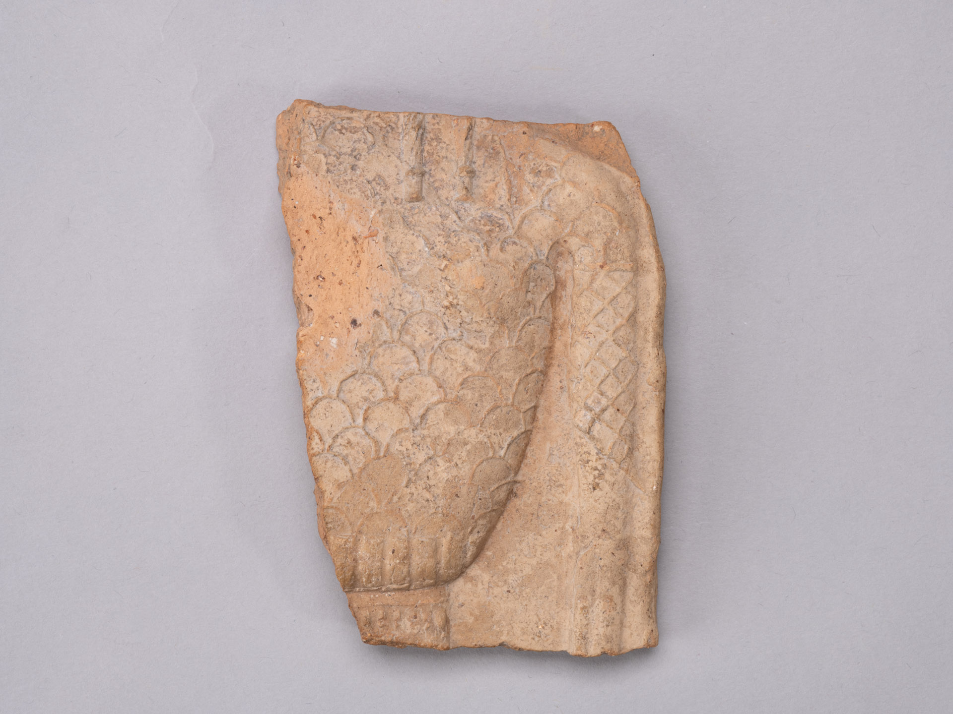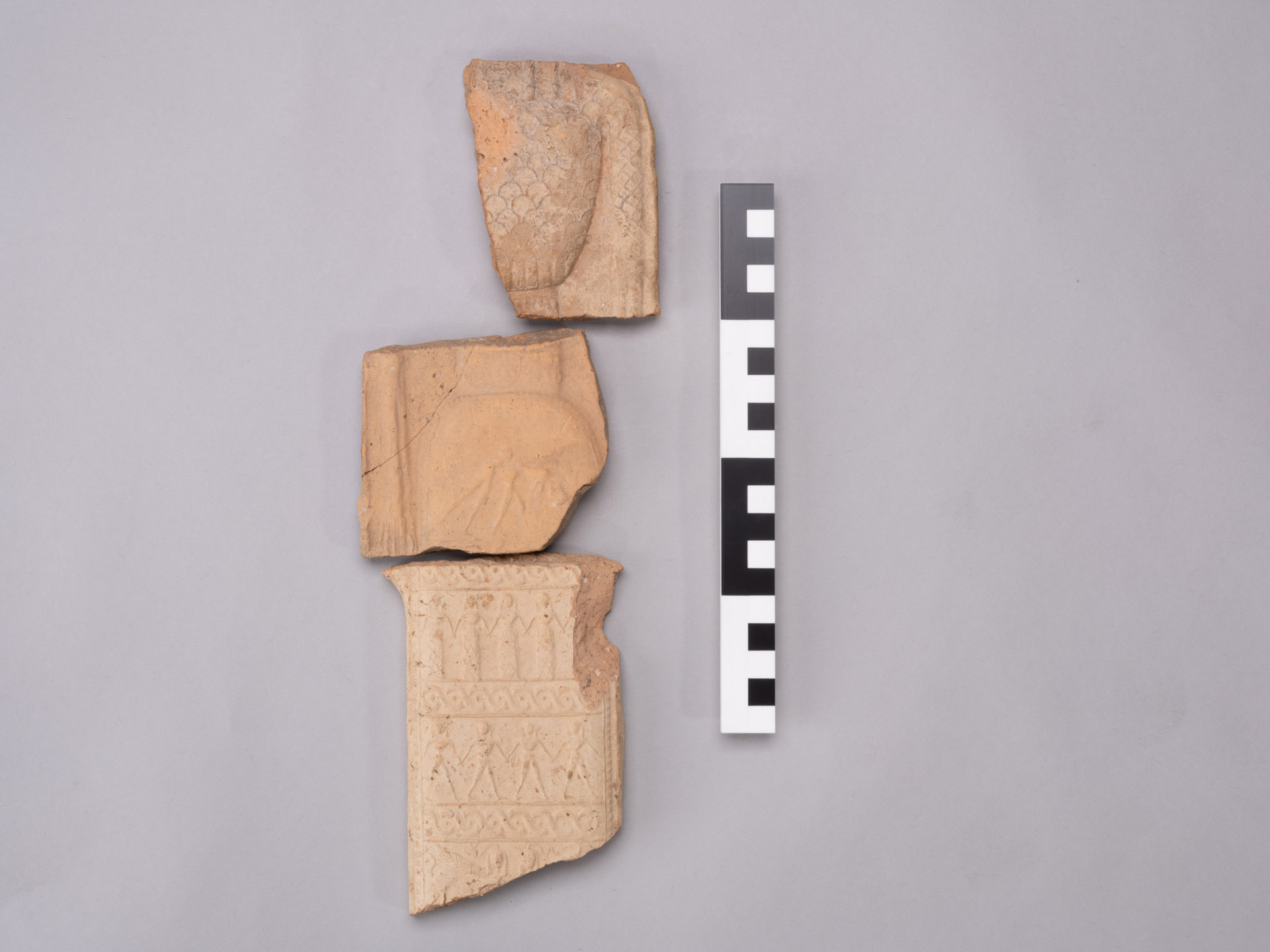 Fragments of a terracotta plaque (pinax) depicting a standing female figure. The first fragment preserves the upper part of the torso, covered by a garment decorated with an arcade motif, along which the