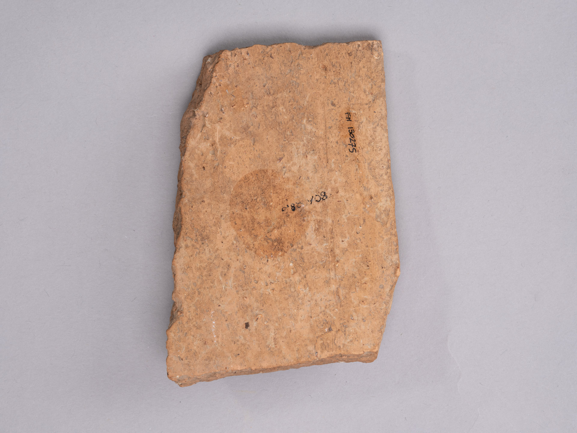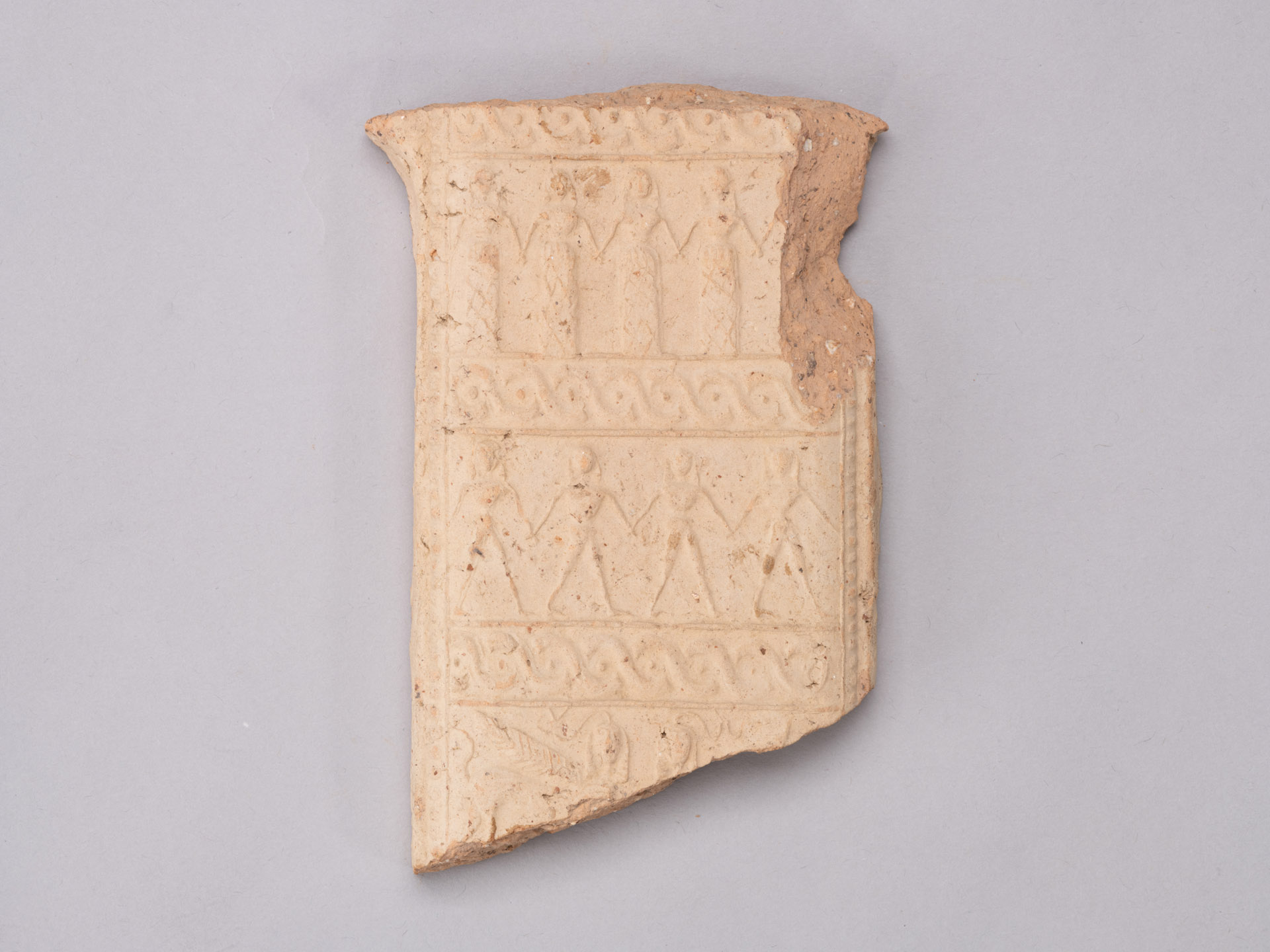 ... read more >Fragments of a terracotta plaque (pinax) depicting a standing female figure. The first fragment preserves the upper part of the torso, covered by a garment decorated with an arcade motif, along which the left arm descends, itself covered by a thin net-patterned fabric. The second fragment corresponds to part of the right arm and the waist of the female figure, wrapped in the upper section of a finely embroidered skirt, which is largely preserved in the third fragment.
