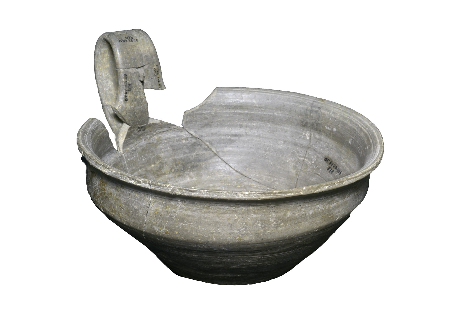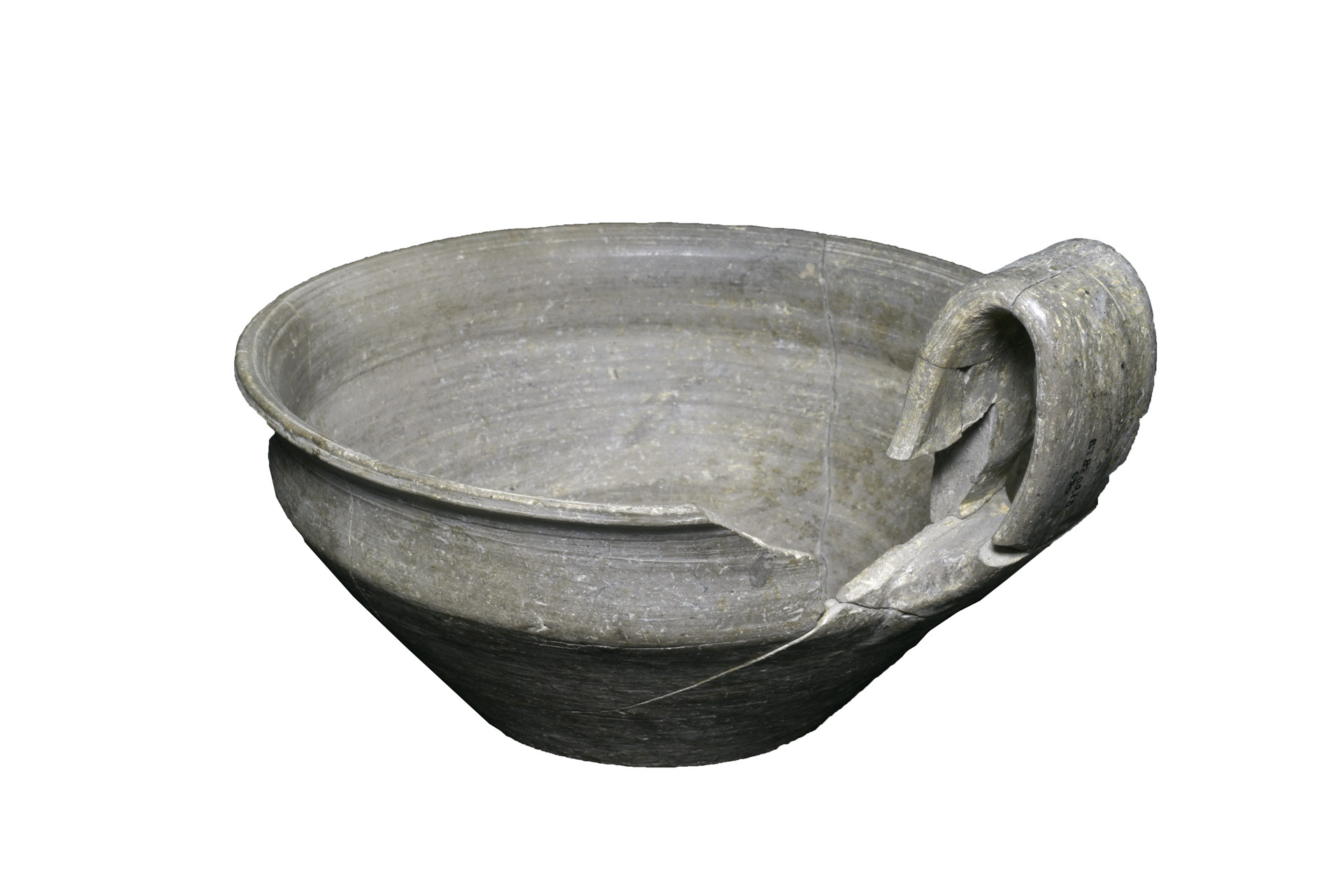 ... read more >Wheel-thrown cup made of gray ware ceramic; it features a flaring rim and a wide, flat strap handle (ansa a nastro) that rises above the rim.