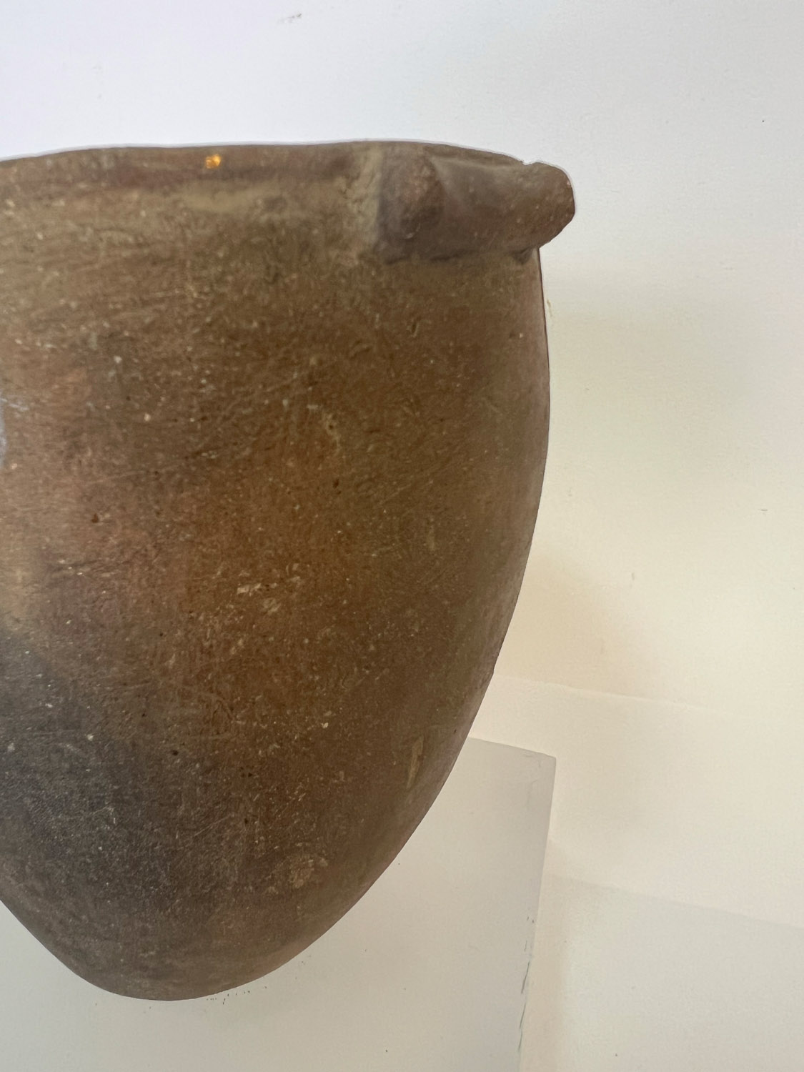 Cylindrical-ovoid vessel (olla) made of coarse, unrefined clay and shaped by hand, known as impasto ware. The handles are spool-shaped, tapering toward the center.