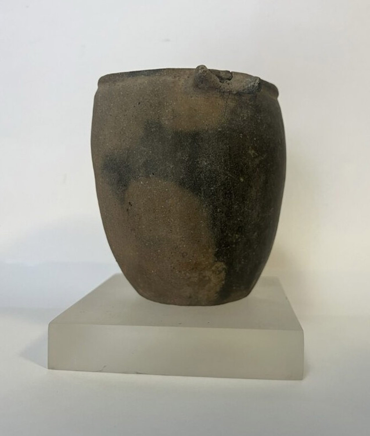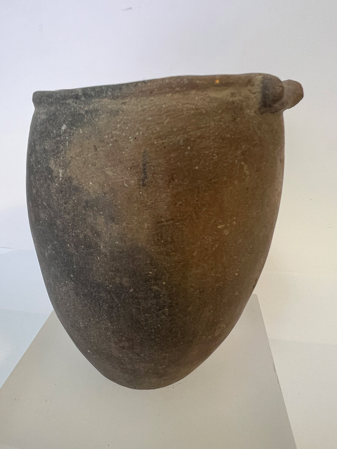 ... read more >Cylindrical-ovoid vessel (olla) made of coarse, unrefined clay and shaped by hand, known as impasto ware. The handles are spool-shaped, tapering toward the center.
