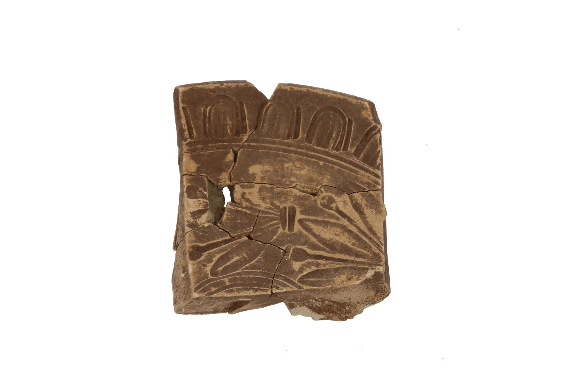 ... read more >Two fragments of a terracotta mould used to decorate vessels and plates in terra sigillata. The decorative motifs are arranged in concentric registers and feature vegetal and floral designs, including a band with myrtle branches and berries, followed by a lower band of double five-petalled rosettes.