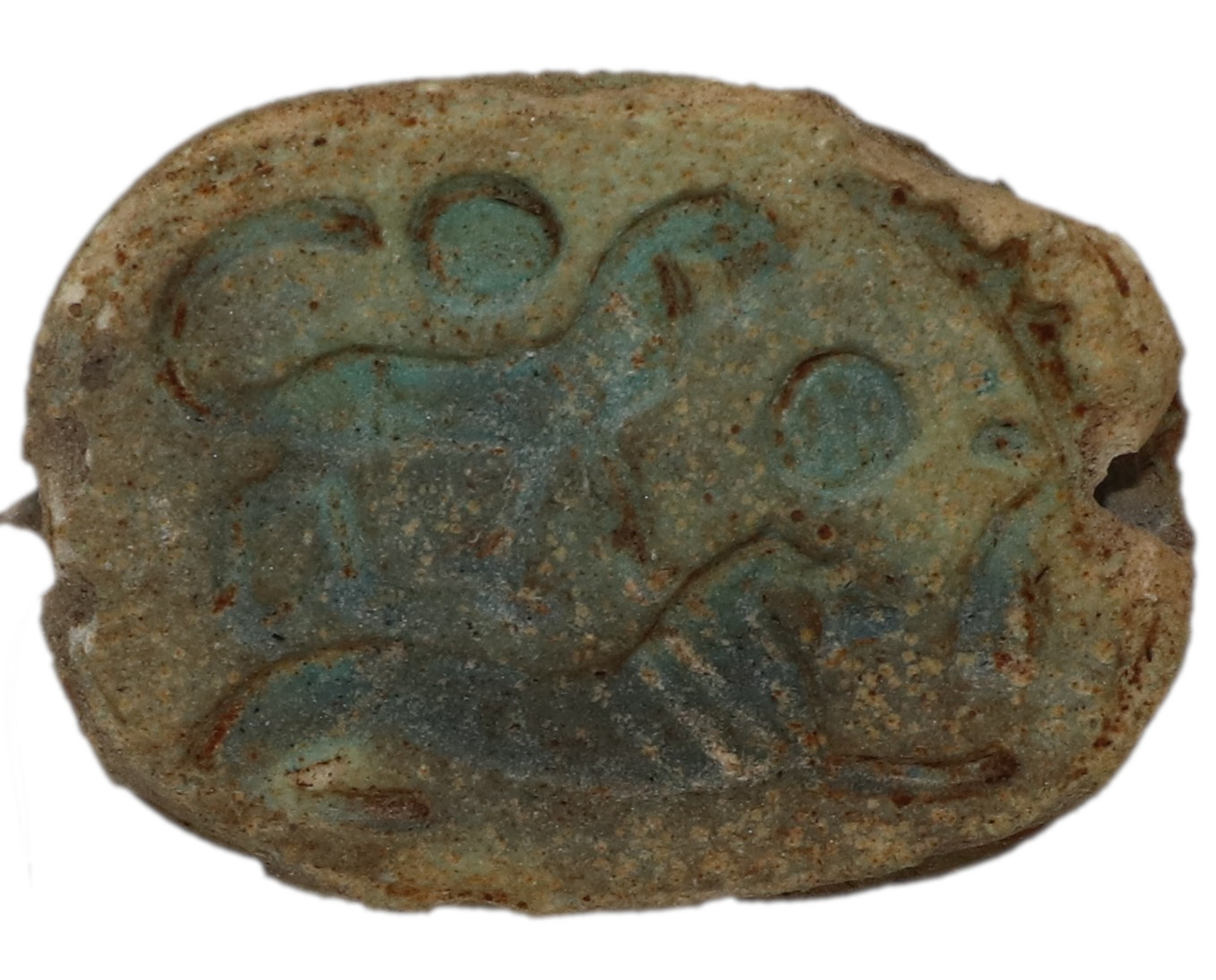 Small amulet in the shape of a scarab. The surface, worked in low relief, features sharp incisions on the flat side depicting motifs with symbolic value: a striding lion and a crouching lion.