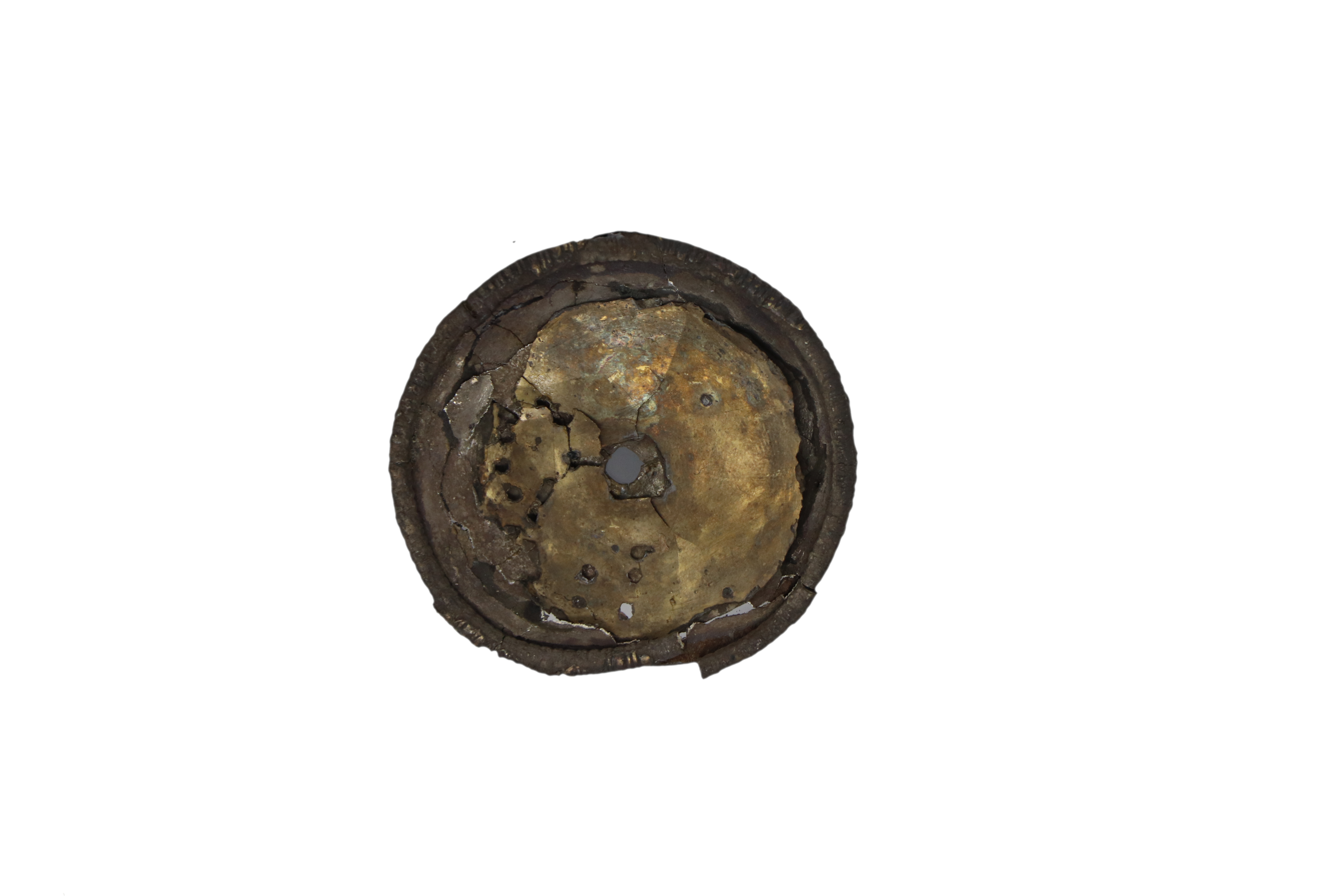 ... read more >Smooth silver disc-shaped boss with raised edges, externally marked by a decoration of incised parallel strokes. The disc is pierced by a square hole, decorated with a gold sheet, originally associated with the passage of a nail in antiquity.