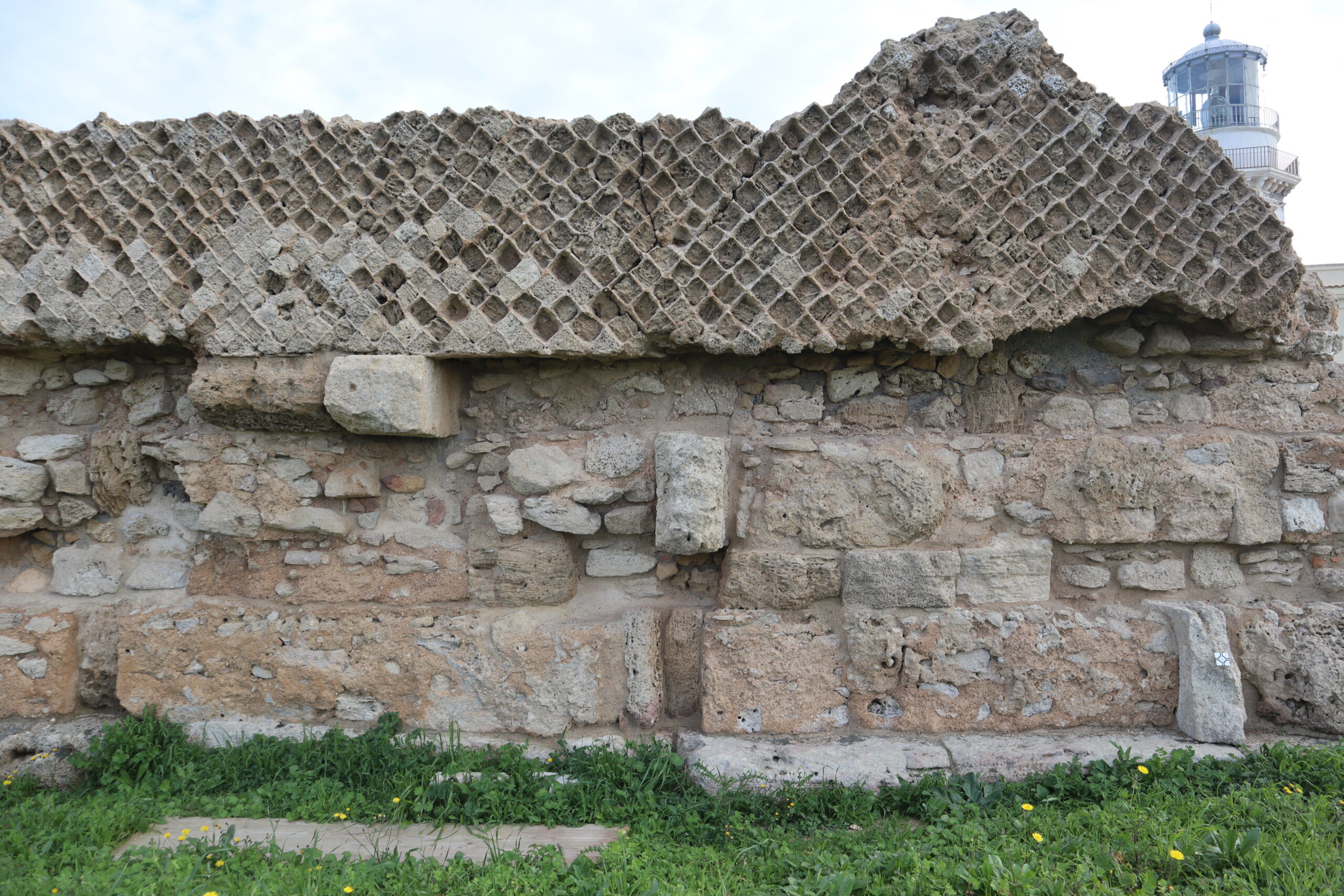 The masonry is composed of large and medium-sized blocks of local calcarenite (opus quadratum), topped by a facing of small square limestone blocks laid diagonally (opus reticulatum). Both facings are bonded to an internal core made of fragments of calcarenite, stones, and terracotta, held together with a mortar of lime, sand, and pozzolana (opus caementitium).
