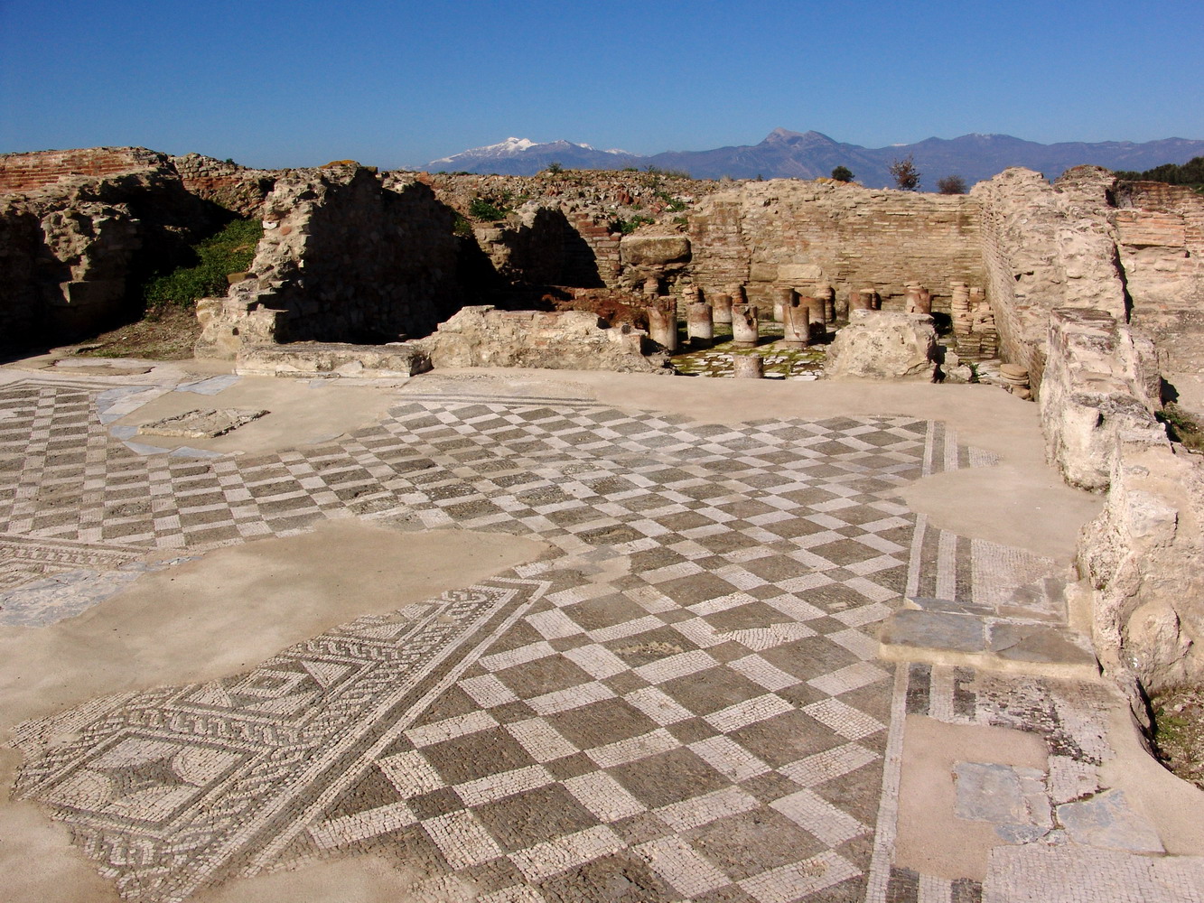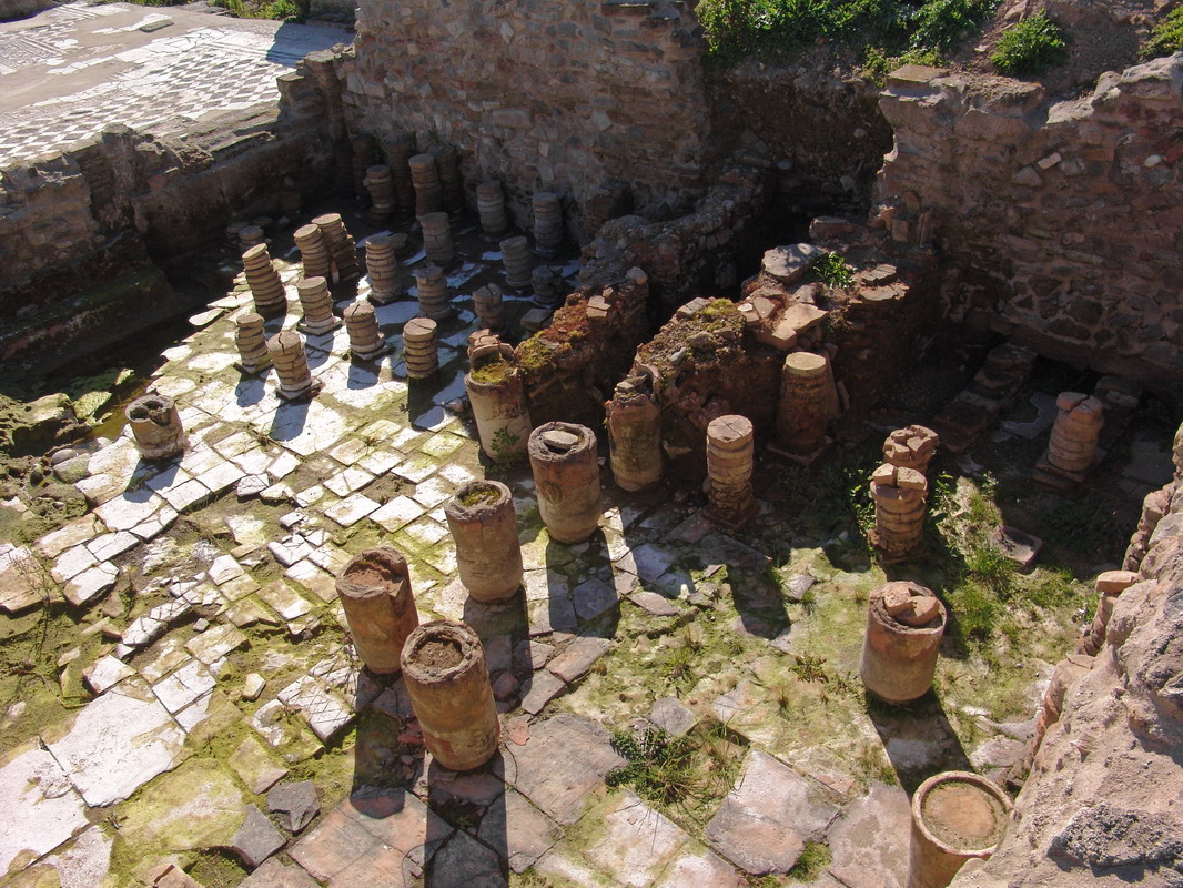 Built around AD 50, the baths of Copiae are located in a central area of the ancient city, near the intersection of two important road axes (plateia A and plateia B) and not far from the semicircular theatre, in what must have been the city’s public district.