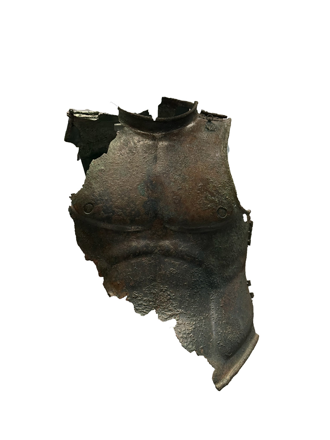 ... leggi di più >Si tratta di una corazza anatomica di tipo bivalve, riproduce la muscolatura stilizzata di un corpo maschile, con i pettorali, gli addominali e dorsali, con particolari a rilievo e incisi. Le due metà anteriore e posteriore sono unite sui fianchi e sulle spalle tramite cerniere e fibbie metalliche, che permettevano di adattare l'armatura al corpo del guerriero, decorate con una piccola placchetta raffigurante una palmetta in rilievo e fissata con catenelle. I bordi mostrano un rinforzo formato da una barra di ferro, sulla quale è piegata una lamina di bronzo.