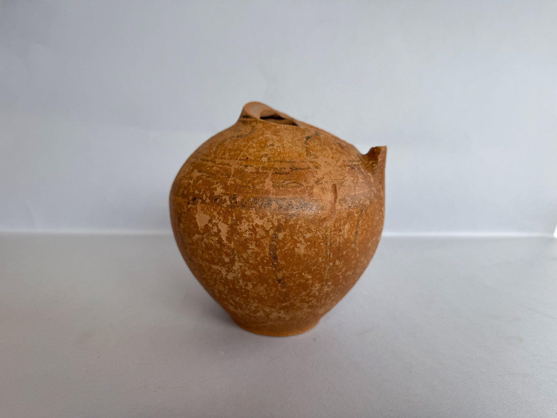 Il frammento appartiene al corpo di una brocca, della quale non si conservano il collo e l’ansa. Essa doveva avere forma ovale, con una presa (ansa) di cui è visibile solo il punto di congiuntura con