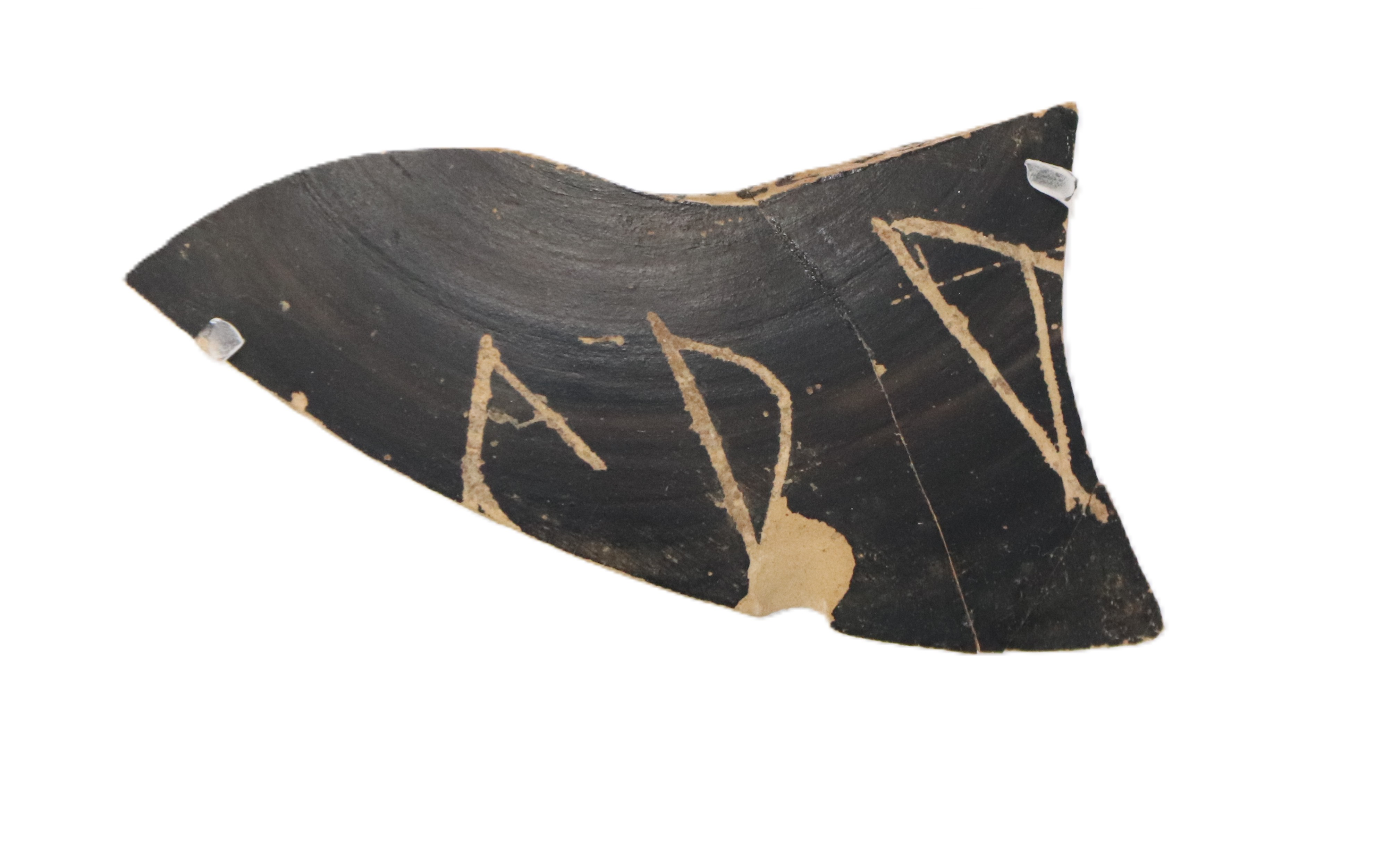 ... leggi di più >Frammento di una coppa da vino (kylix) in ceramica a vernice nera, con lettere incise (H)ERA.