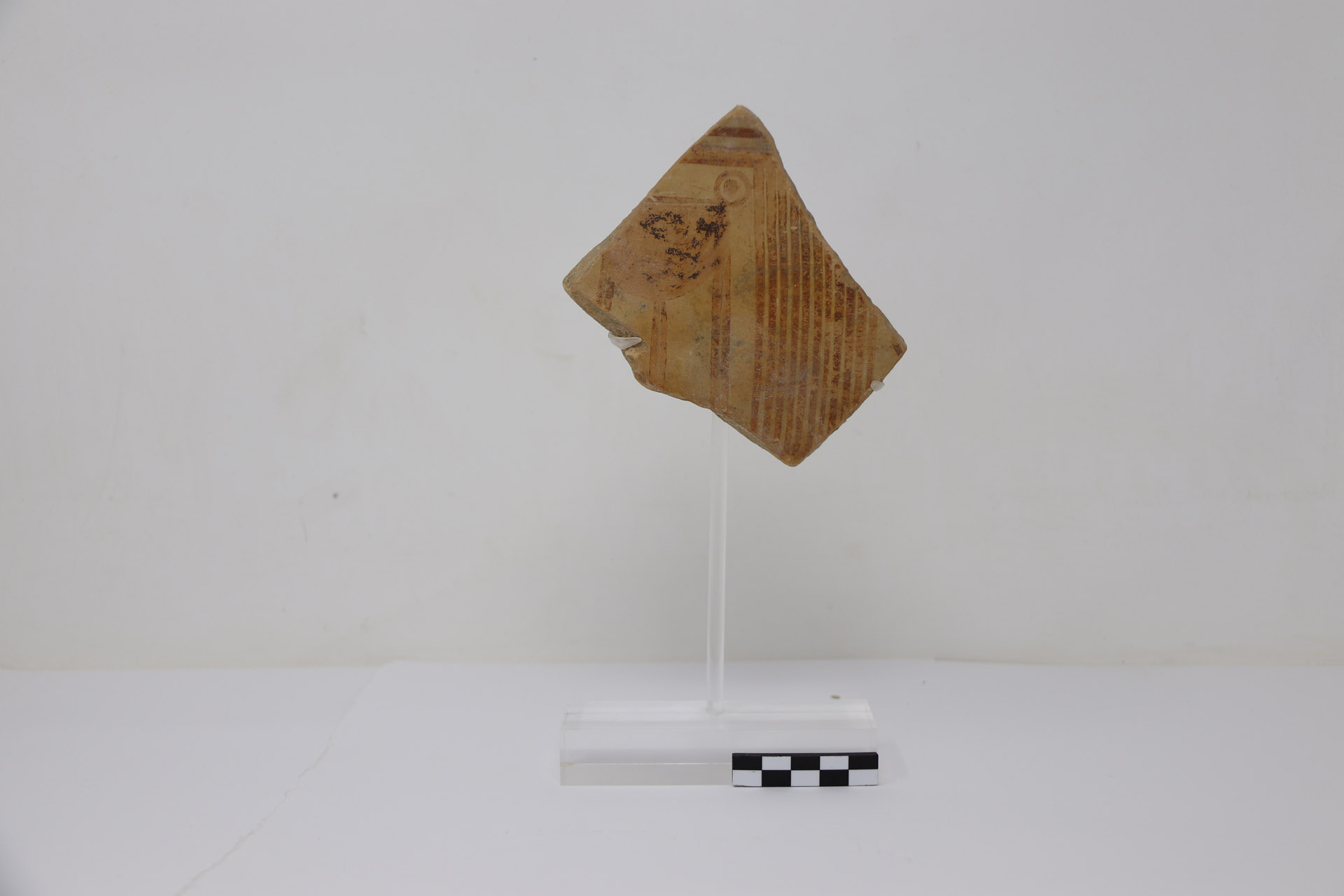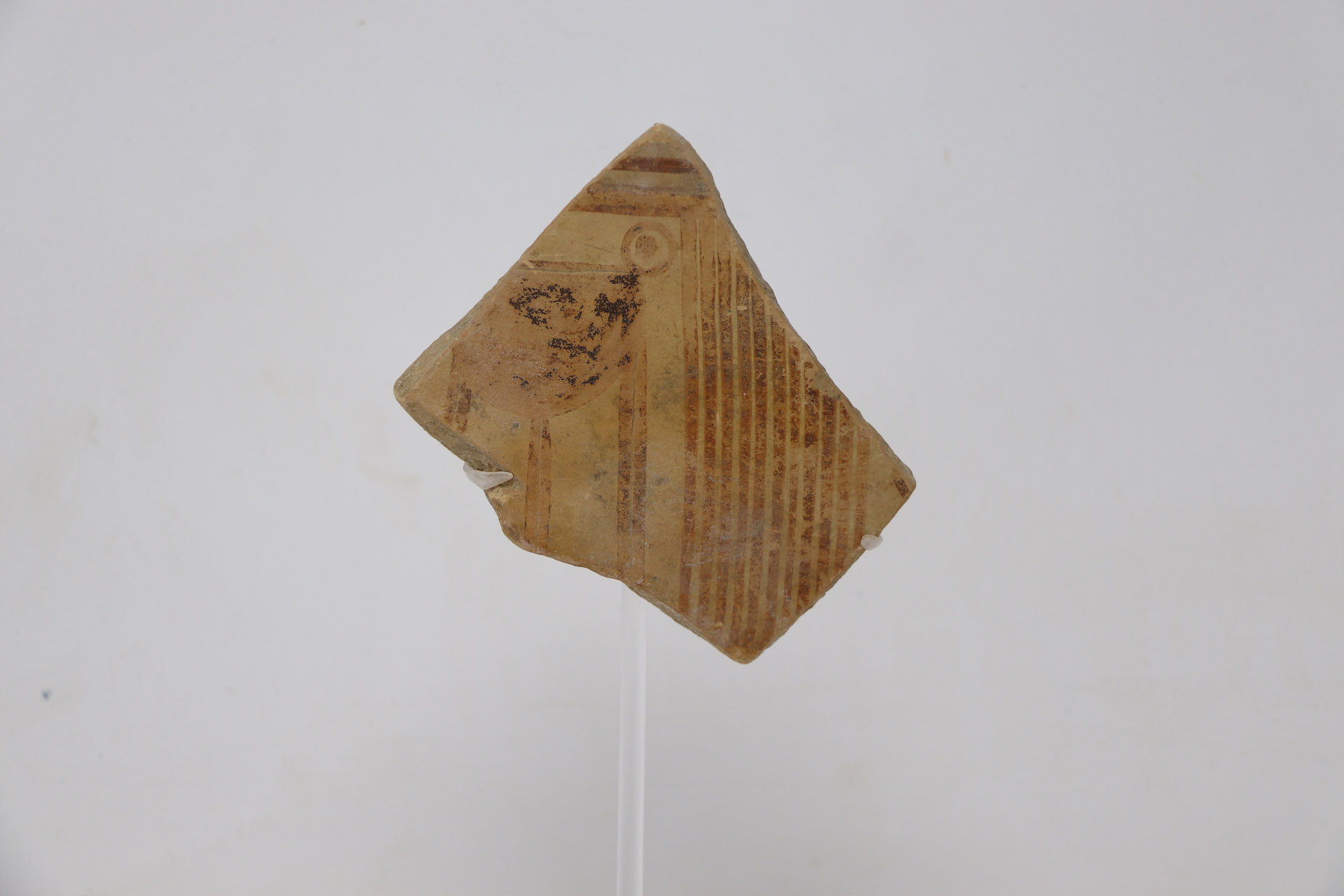 ... leggi di più >Il frammento appartiene alla spalla e a una piccola parte del collo di un cratere, vaso di grandi dimensioni utilizzato per contenere il vino. È realizzato al tornio con un’argilla di colore beige-ocra. La decorazione, dipinta con una vernice bruna tendente al rossiccio, presenta linee verticali parallele che delimitano un riquadro (metopa), all’interno è rappresentato un vaso con sostegno a tre piedi (tripode). Questo è raffigurato con una vasca profonda e una presa (ansa) circolare, l’unica conservata, posta in cima alla vasca; i tre sostegni sono tracciati con doppie linee parallele. Danno parte della decorazione anche sottili incisioni che delineano le varie parti dell’oggetto.