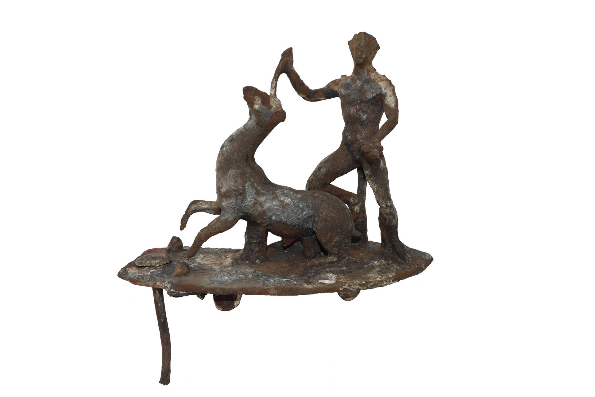 Piccola scultura in bronzo raffigurante la terza fatica di Eracle: la cattura della cerva di Cerinea, animale sacro ad Artemide, noto per le sue corna d’oro. L’eroe è ritratto mentre la blocca con