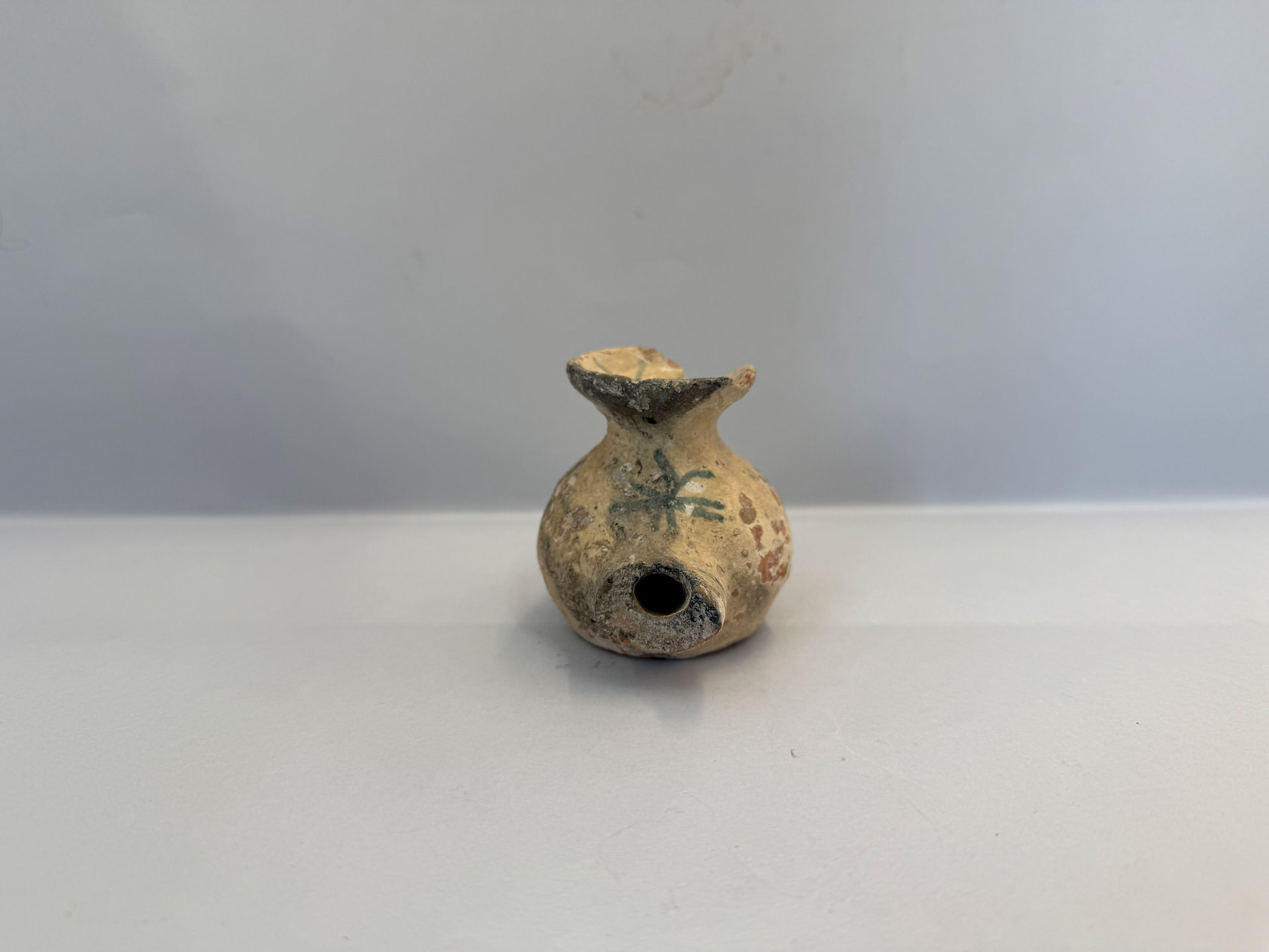 ... leggi di più >La lucerna presenta un corpo di forma globulare, con il beccuccio allungato e il foro centrale di alimentazione a disco svasato. Sul corpo si trova una decorazione ad asterischi di colore bruno su sfondo chiaro.