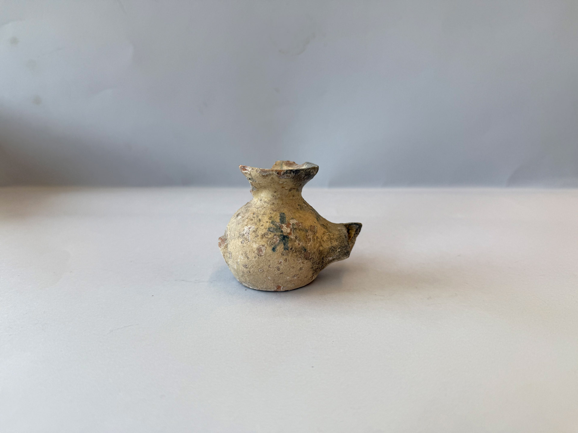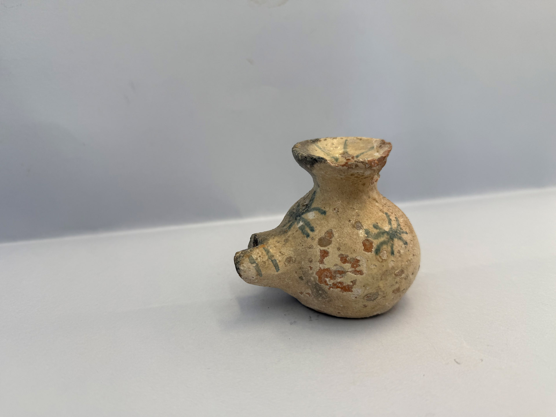 Questa lucerna è una delle testimonianze della frequentazione di Rione Vecchio, l’attuale centro storico di Amendolara, che si colloca fra il 1100 e il 1300 d.C. circa. Si tratta di una piccola lampada ad olio, della quale si distinguono tre elementi: il corpo (o vasca) è il serbatoio che contiene l’olio; il beccuccio è la parte da cui sporge lo stoppino, consentendo all’olio di bruciare lentamente; l’ansa (o manico) serve per tenere la lucerna in mano o appenderla. Oltre a illuminare case e templi, con il tempo le lucerne divennero anche un ex voto da offrire alle divinità nei luoghi sacri e un dono per il defunto.