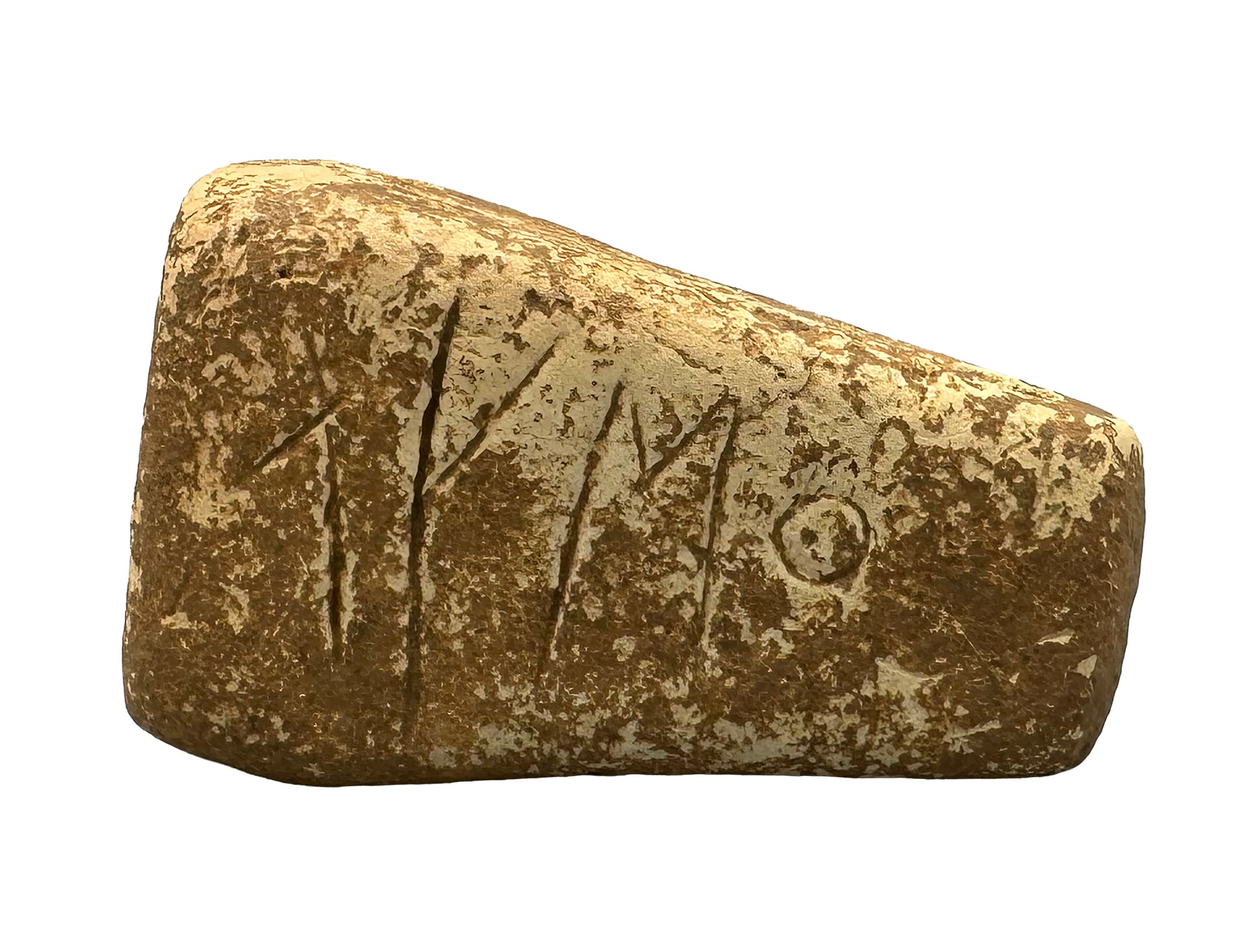 ... leggi di più >Peso da telaio di forma piramidale, provvisto di un foro situato sotto l’apice, cioè nella parte immediatamente inferiore alla punta superiore. La superficie appare piuttosto scabra e abrasa. È presente un’iscrizione graffita “Tymo”, realizzata con l’alfabeto greco-acheo e in forma retrograda, cioè tracciata in senso inverso rispetto alla normale direzione della scrittura.