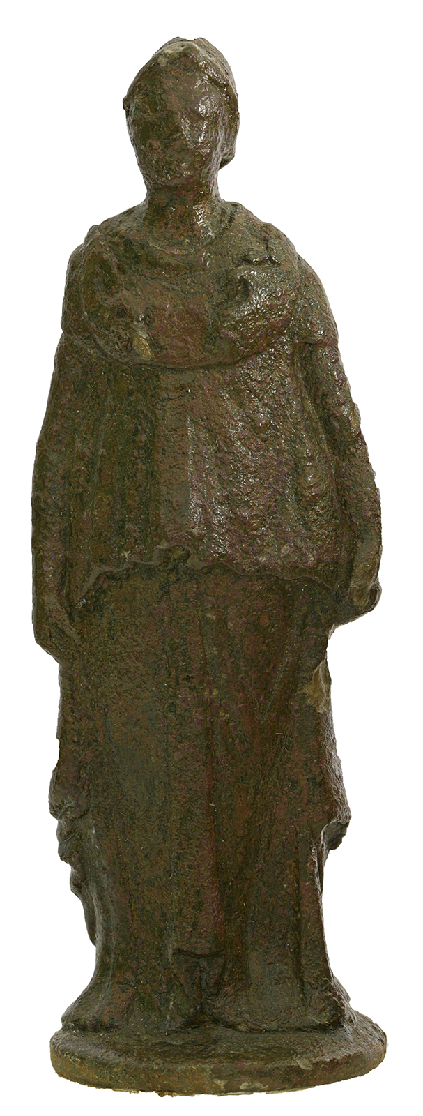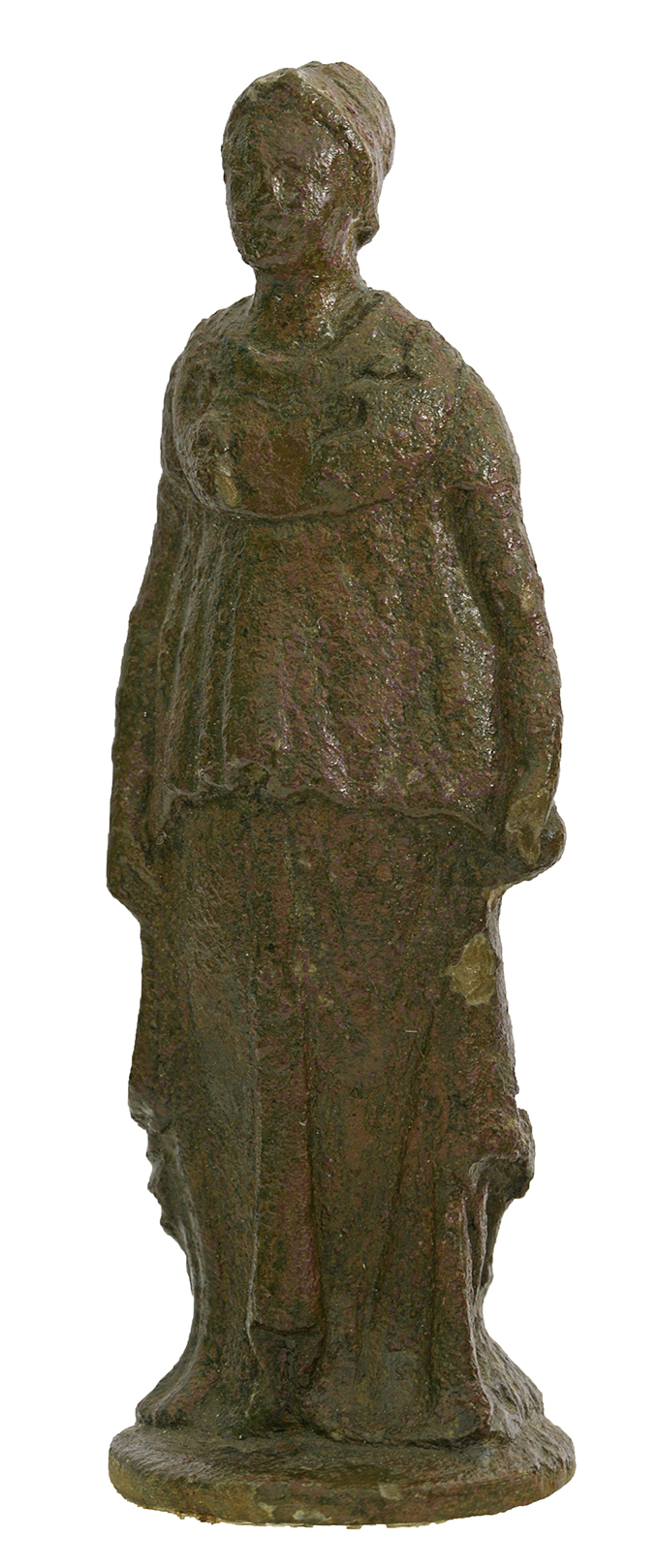 ... leggi di più >La statuina, realizzata in bronzo a fusione piena, rappresenta una figura femminile identificabile con Atena, riconoscibile dal caratteristico elmo che indossa leggermente rialzato sulla fronte. La dea è rappresentata in piedi, in una posa calma e composta. Indossa una veste lunga (chitone), sopra la quale si distinguono, all’altezza del petto, alcune parti della pelle di capra (ègida), che tiene appoggiata sulle spalle. Le braccia scendono lungo i fianchi, in atteggiamento di quiete e dignità.