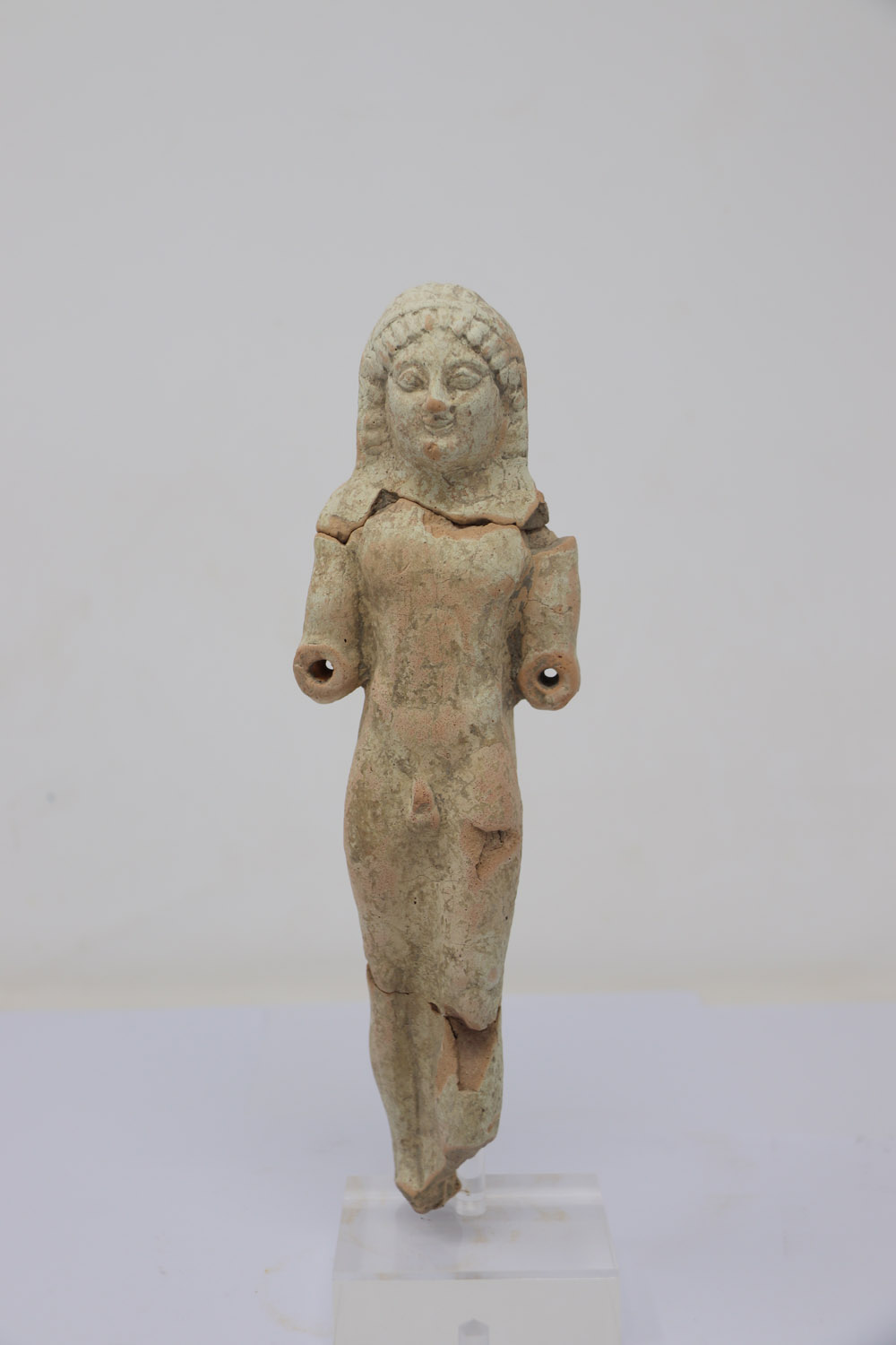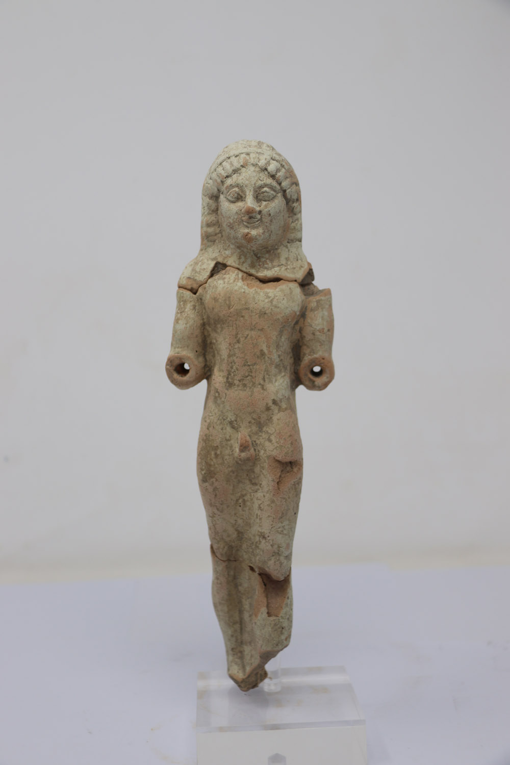 ... leggi di più >La statuetta rappresenta una figura maschile in piedi (kouros) in piedi, con il peso del corpo appoggiato sulla gamba destra, mentre la sinistra è in posizione leggermente avanzata. Il volto, piccolo e tondeggiante, presenta occhi obliqui e zigomi marcati; i capelli sono resi con ciocche, definite da piccoli solchi regolari. All’altezza dei gomiti si trovano due fori destinati all’inserimento degli avambracci, oggi non più conservati, che probabilmente erano tesi in avanti in un gesto di offerta. Questo elemento permette di riconoscere la figura come un offerente.