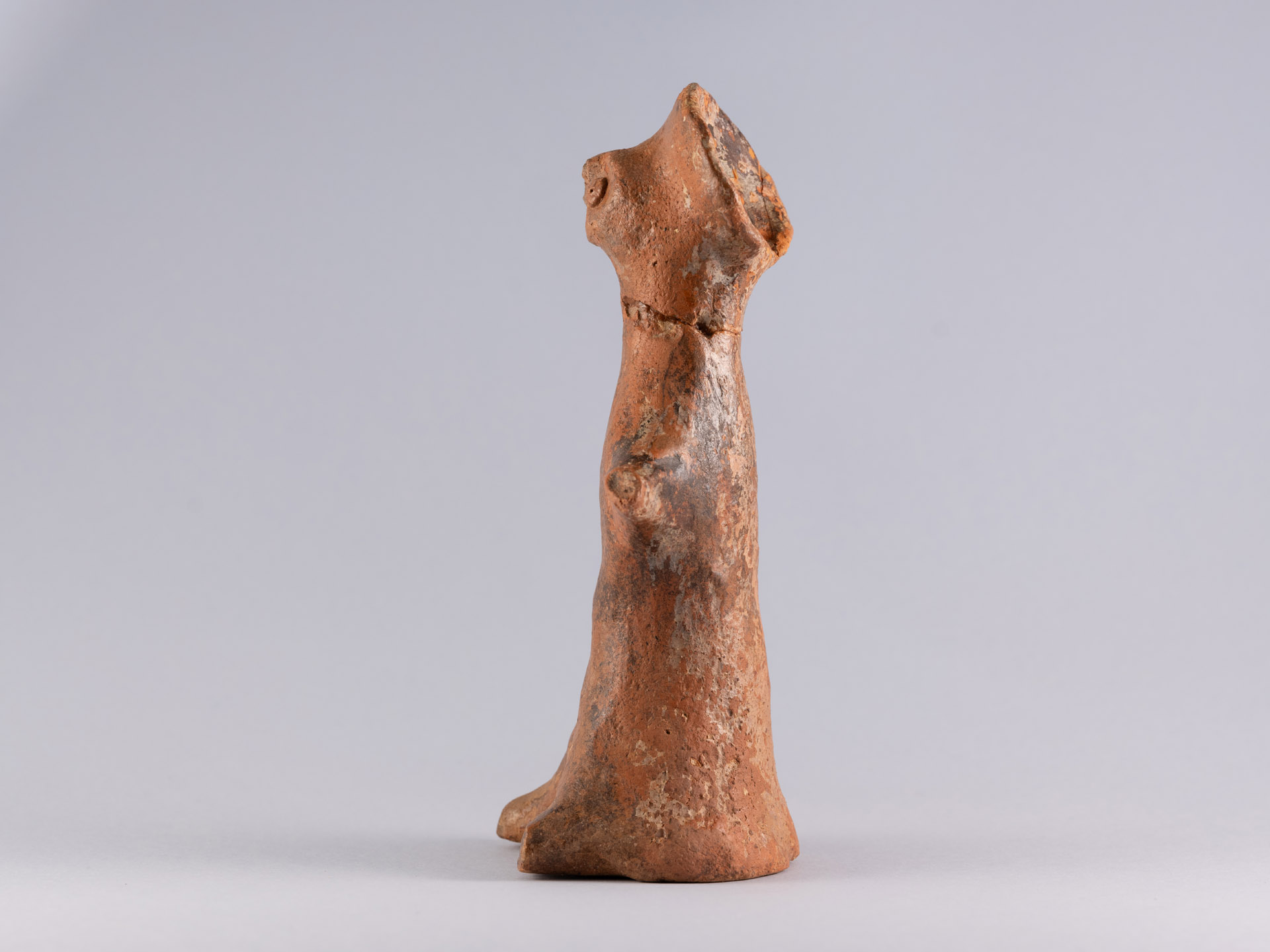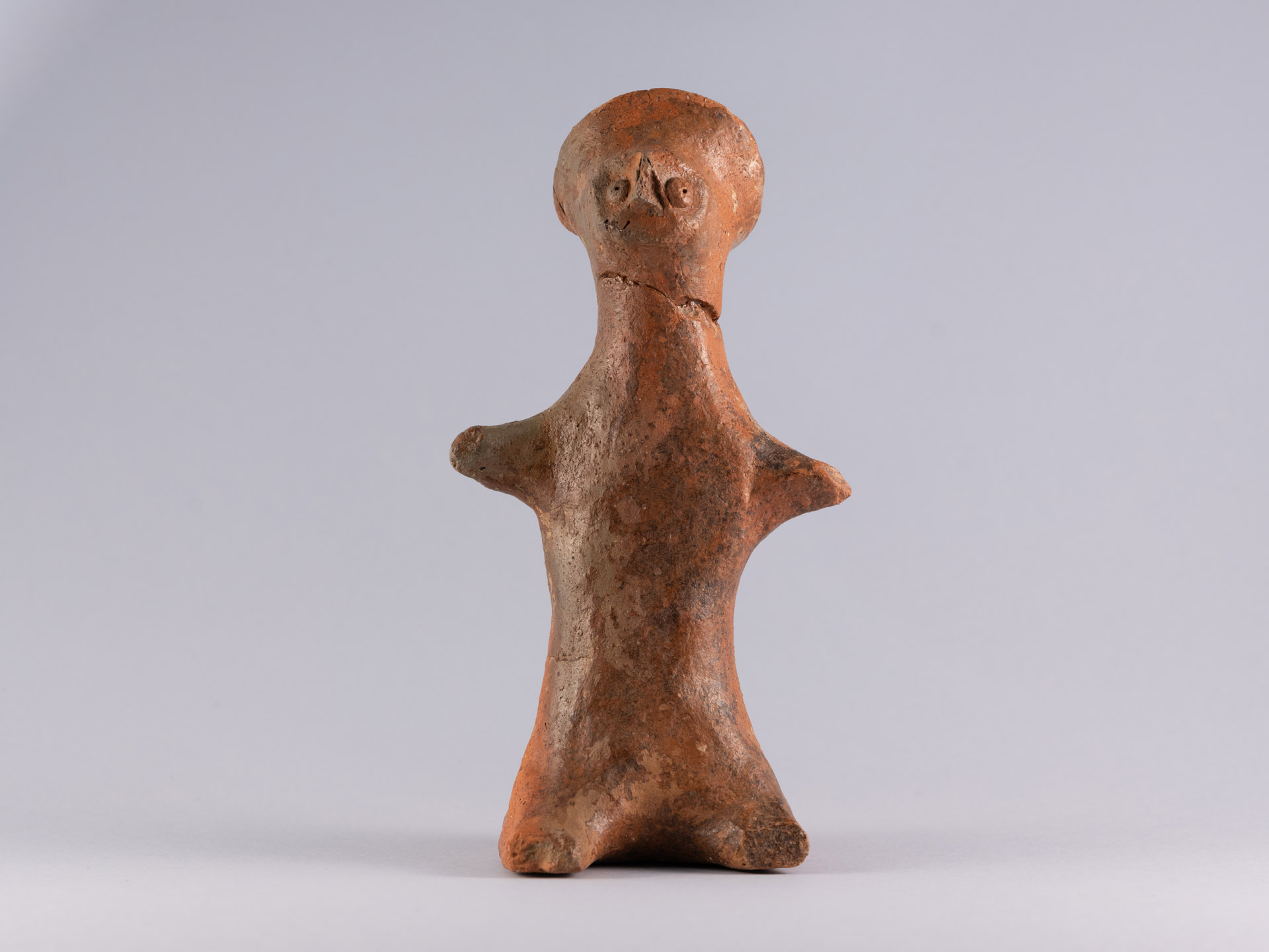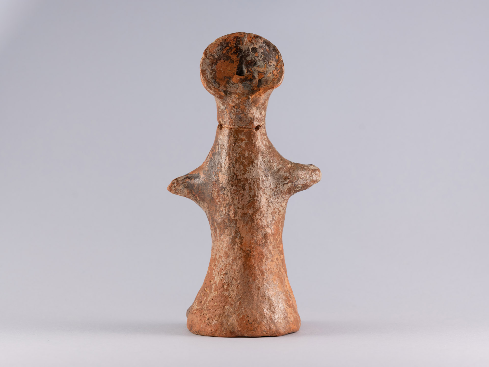 ... leggi di più >La statuetta, modellata a mano in terracotta di colore rossiccio, rappresenta una figura femminile stilizzata, in piedi. Il volto, di forma triangolare, ha fronte e mento leggermente infossati, che danno alla testa un profilo semplice ma caratteristico. Sulla sommità della testa è presente un copricapo basso e rigido, probabilmente simbolico o legato a qualche rituale. Al centro del copricapo c’è un piccolo foro verticale, realizzato prima della cottura della statuina, che doveva servire a fissare un ornamento oggi perduto, come un piccolo accessorio, probabilmente un inserto metallico o una catenina decorativa.