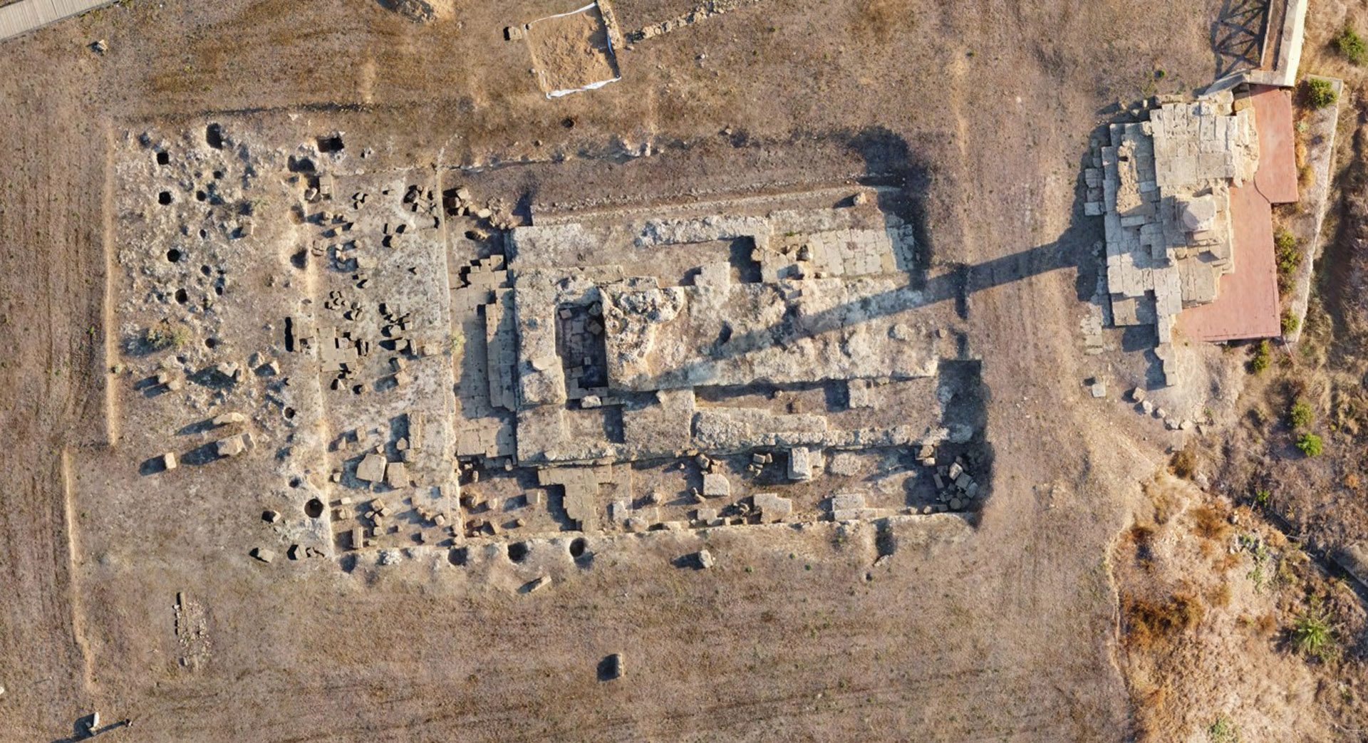 Il maggiore edificio di culto del santuario era un maestoso tempio con colonne doriche in pietra calcarea locale (sei sui lati brevi e quattordici sui lati lunghi), perfettamente orientato astronomicamente in senso est-ovest e con un enorme basamento di 22x55 m. L'unica colonna oggi conservata era la seconda posta lungo il lato breve, rivolto verso il mare. Il tempio aveva un aspetto imponente: tegole e coppi, in marmo bianco proveniente dall’Egeo, componevano il tetto; questo era ornato con sculture, anch’esse in marmo greco, raffiguranti cavalli e figure femminili, probabilmente divine e legate ad un racconto mitologico. La sua ricchezza decorativa, che ha pochi confronti nel mondo greco e magno-greco del V secolo a.C., restituisce l’immagine di una città estremamente florida e testimonia